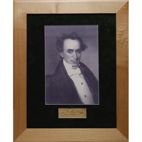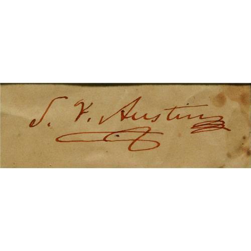 <B>"Father of Texas" Stephen F. Austin Signature.</B></I> Stephen F. Austin, one of Texas' forefathers, signs his piece of paper in crisp, dark ink. Austin helped found present-day Texas. He began as a frontier lawyer and obtained permission to settle three hundred families in Texas. He was a very powerful executive and increased the number of people in Texas. He opposed annexation from America before the Texas Revolution. He was defeated for the Presidency of Texas by Sam Houston and died a year later. The slip of paper measures, 3.25" x 1" and is handsomely mounted with green suede and a print of Austin. The entire piece measures, 14" x 17". <I>Courtesy of J. P. Bryan, Houston.</B></I> Consigned Lot <BR><BR><b>This 2006 March Texas State Historical Association Charity Auction is being held in Austin, TX on February 12 - March 4, 2006. This is a charity auction. All proceeds from donated lots in the auction, commissions from consigned lots, and the buyer's premium go solely to the Texas State Historical Association. The floor auction session is by invitation only. Online bidding ends March 3, 2006 at 10:00PM CT. Your secret maximum bid will compete for you during the floor auction, and it is possible that you may be outbid on the floor after internet bidding closes. The applicable buyer's premium for this auction is an amount equal to 15% (minimum $9 per lot) of the successful bid on ebay. State law requires lots consigned (not donated) to THSA collect full sales tax on items that sell for a total of $5,000 or more. </b>