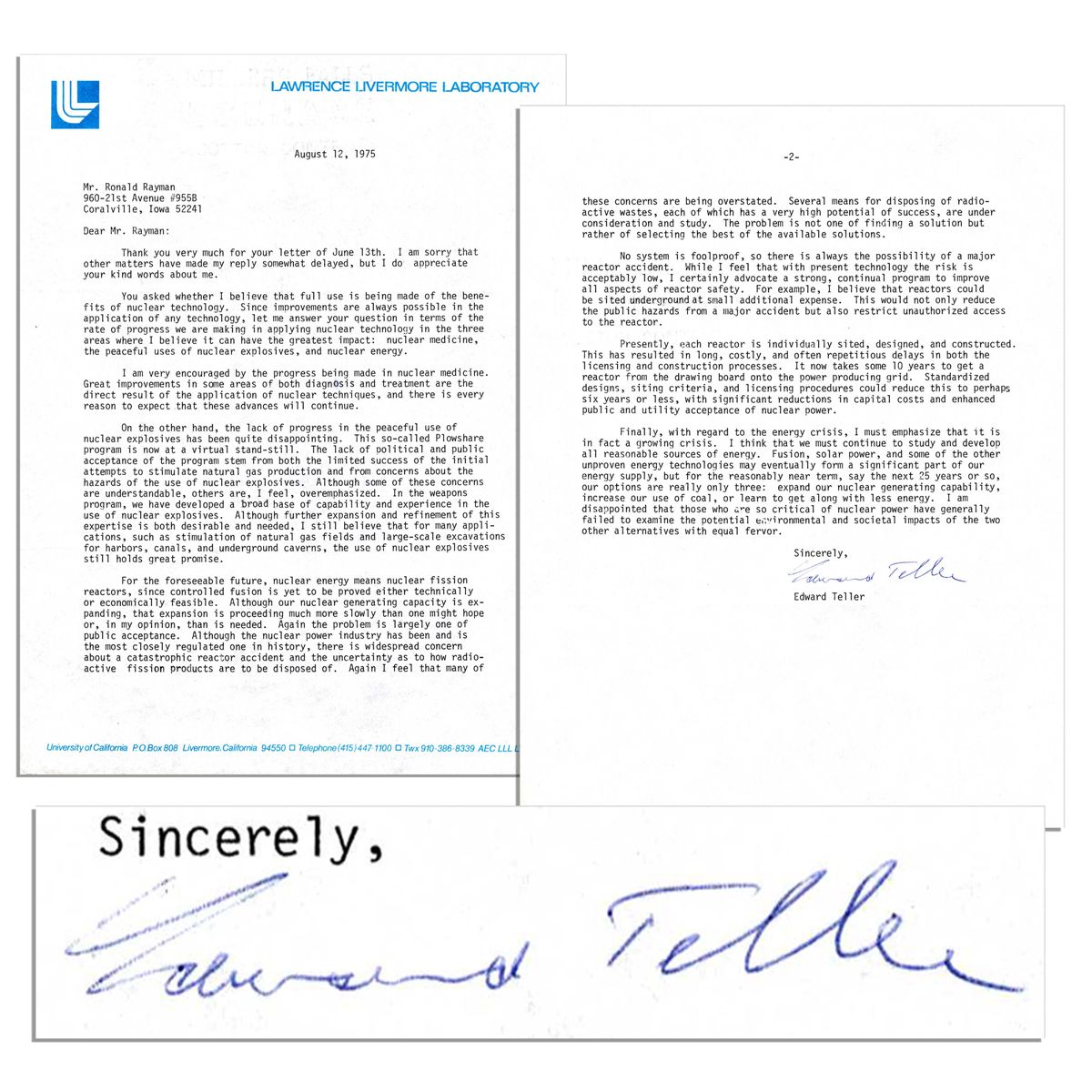 Physicist Edward Teller typed letter signed with excellent content regarding nuclear energy. Dated 12 August 1975 on Lawrence Livermore Laboratory stationery, letter is signed in blue ink, ''Edward Teller''. It reads in part: ''...Let me answer your question in terms of the rate of progress we are making in applying nuclear technology in the three areas where I believe it can have the greatest impact: nuclear medicine, the peaceful uses of nuclear explosives, and nuclear energy...the lack of progress in the peaceful use of nuclear explosives has been quite disappointing...For the foreseeable future, nuclear energy means nuclear fission reactors...'' 2pp. letter on 2 sheets measures 8.5'' x 11''. Near fine.