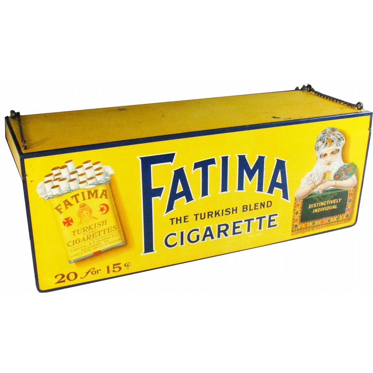Fatima Cigarettes hanging tin store display shelf. A few light scratches on front, and slight paint loss on top, otherwise excellent condition. 24 X 9 X 8 inches.