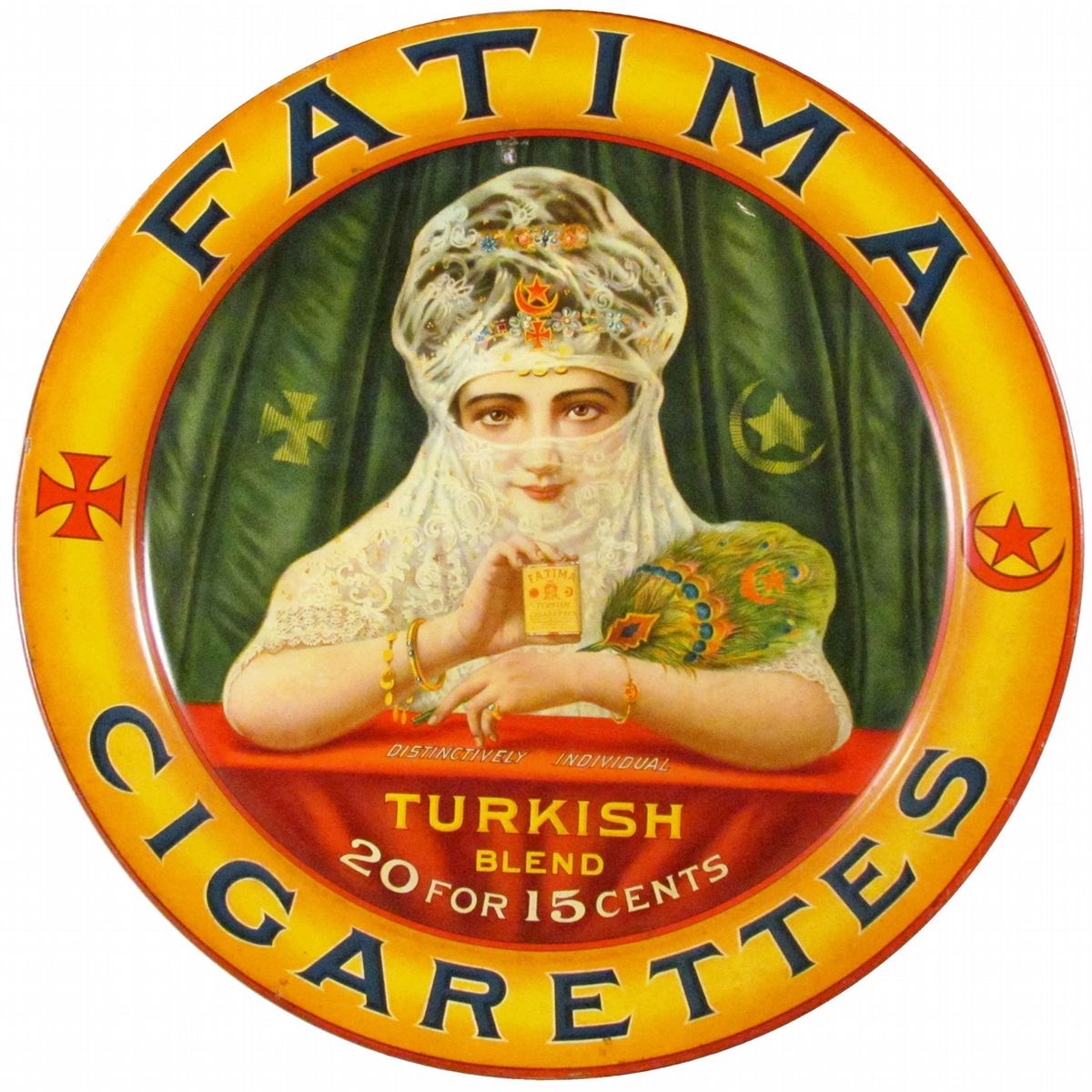 Fatima Cigarettes Tin Charger. Hole at 12:00 and edge wear otherwise excellent condition. 19 inch diameter.