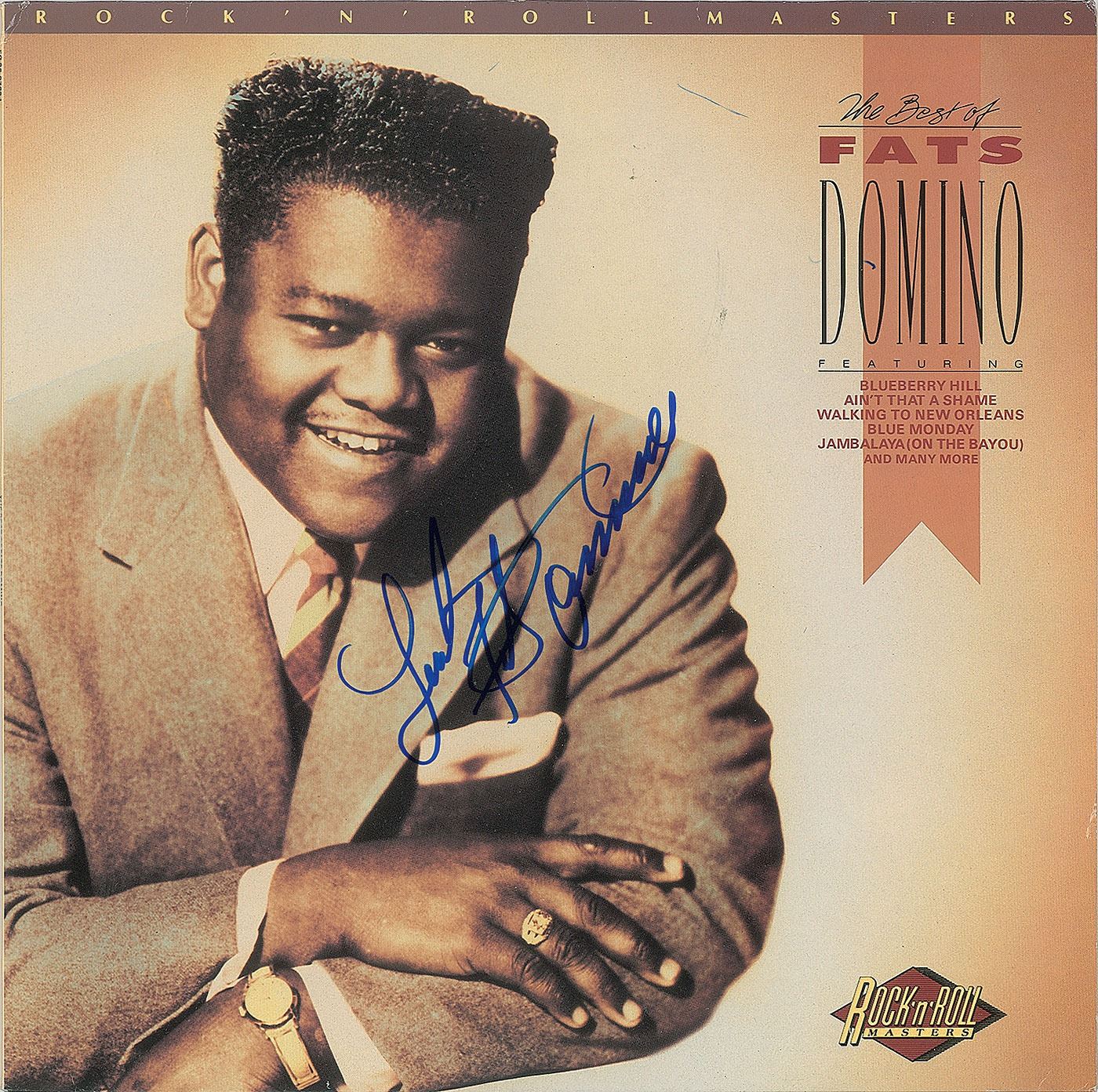 The Best of Fats Domino album signed on the front cover in blue felt tip, "Luck, Fats Domino." In fine condition. The record is included.