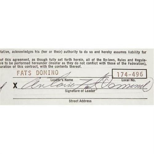 <B>Fats Domino Signed Contracts.</B></I> Set of four booking contracts dating from 1977-79, each signed by the Rock and Roll legend on their respective front pages. In overall Very Fine condition. <I>Accompanied by LOA from PSA/DNA.</B></I><BR><BR><b>Shipping:</b> Flat Material, Small (<a target="_blank" href="http://www.heritageauctions.com/common/shipping.php">view shipping information</a>)