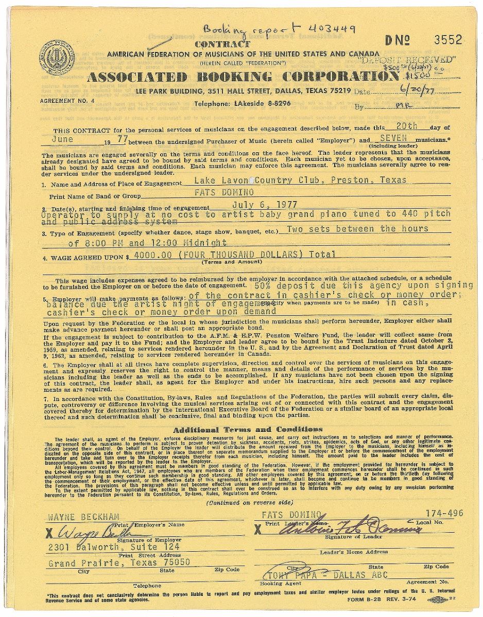 DS, signed “Antoine Fats Domino,” one page, 8.5 x 11, June 20, 1977. American Federation of Musicians of the United States and Canada booking contract in which Domino agrees to perform two sets at the Lake Lavon Country Club in Preston, Texas, on July 6, 1977, for a total sum of $4000. Signed at the conclusion in black felt tip by Domino. Attached are two copies of the contract and two letters from an Associated Booking Corp. representative. In fine condition.