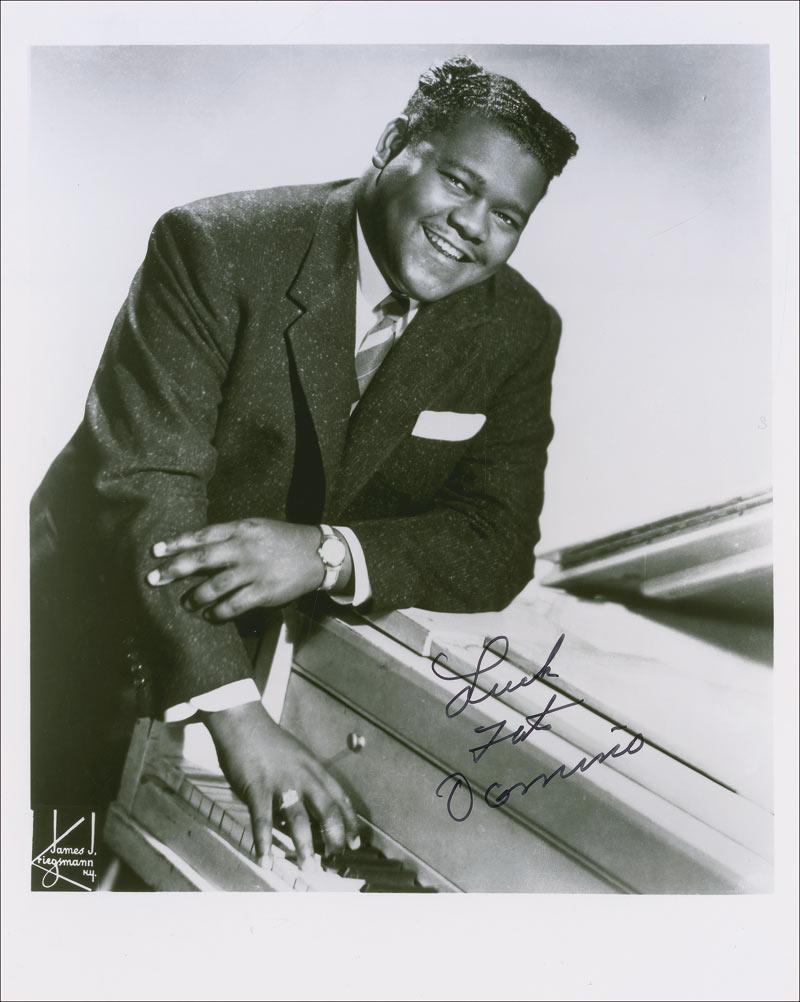 Two different glossy 8 x 10 photos each signed in black felt tip, “Luck, Fats Domino,” with one image signed twice. In fine condition.