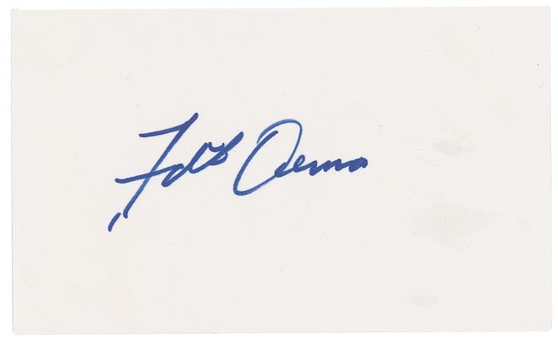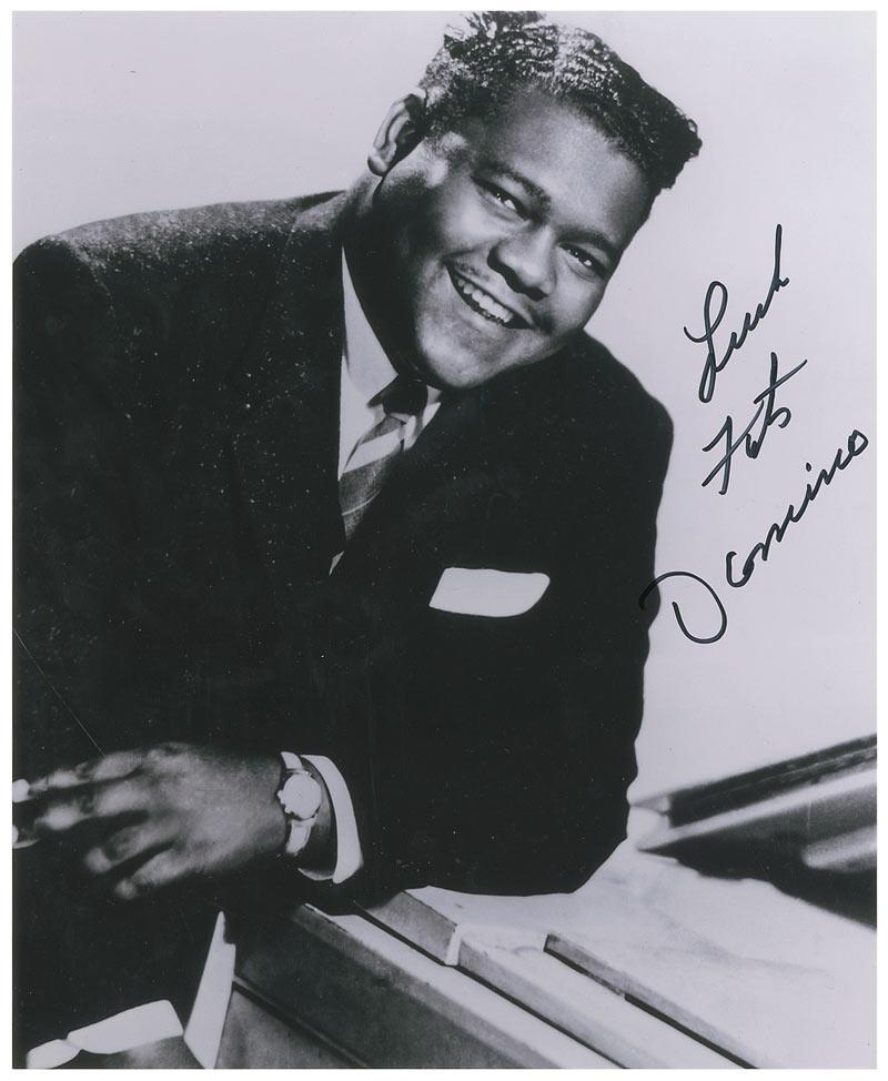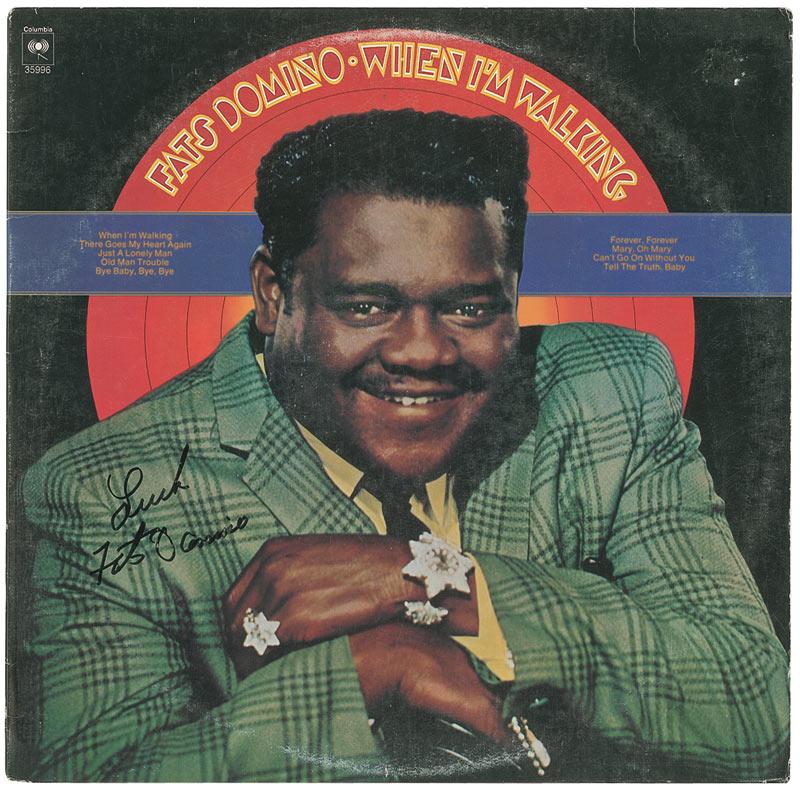 Four items: When I’m Walking album, signed on the front cover in black felt tip (the record is included); a felt tip and ballpoint signature each on individual off-white 5 x 3 cards; and a glossy 9 x 11 photo of Domino leaning on a piano, signed in black felt tip. Two noticeable streaks to emulsion of photo, light ‘ring of wear’ to album cover, as well as some other scattered surface marks to covers, otherwise fine condition.