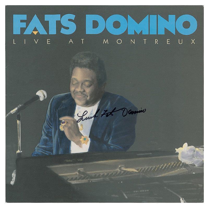 Live at Montreux album signed on the front in black felt tip, “Luck, Fats Domino.” In fine condition, with light creasing to the bottom right corner and a discount cut to the bottom edge. The record is not included.