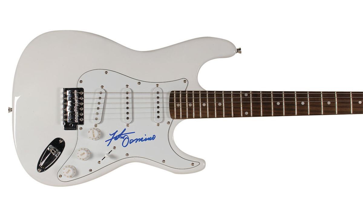 White-bodied Stedman Pro ‘stratocaster-style’ electric guitar, nicely signed on the white pickguard in blue felt tip. In fine condition. Oversized.
