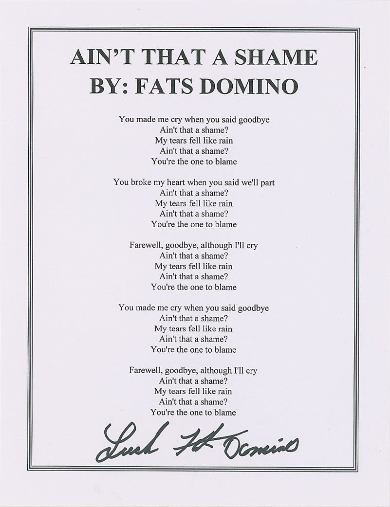 Souvenir printed lyrics to ‘Ain’t That a Shame’ on an off-white 8.5 x 11 sheet, signed in black felt tip along the bottom, “Luck, Fats Domino.” In very fine condition.