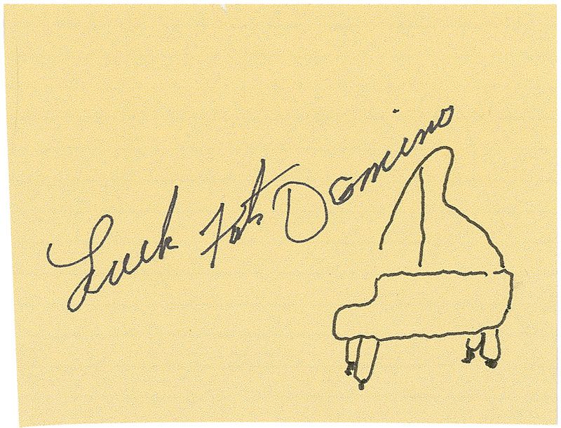 Original signed felt tip sketch of a grand piano on a yellow 5 x 3 card, signed “Luck, Fats Domino.” In fine condition.