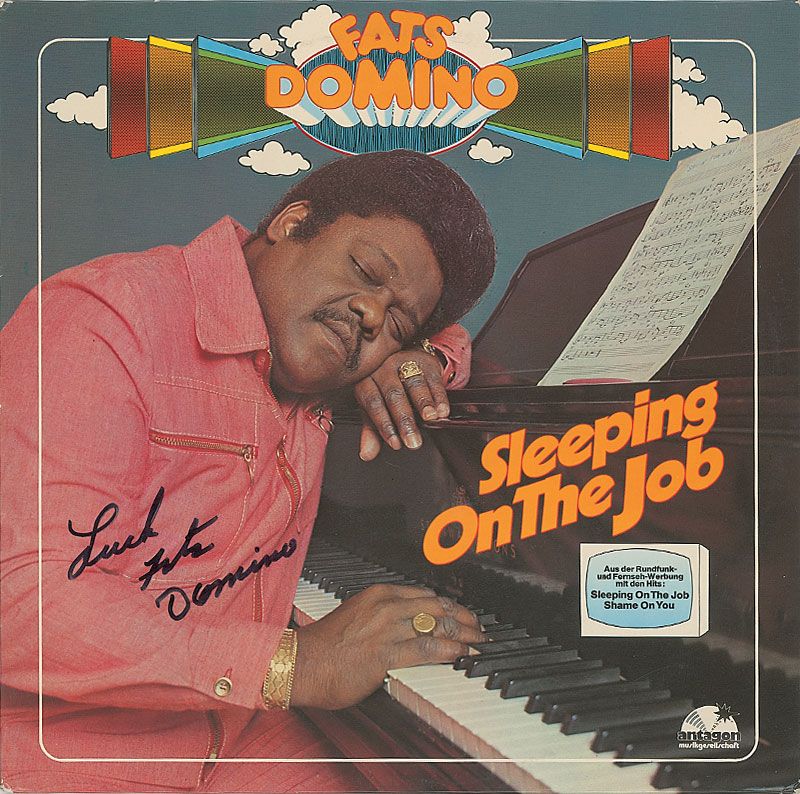 Sleeping on the Job album signed on the front cover in black felt tip, “Luck, Fats Domino.” In fine condition, with a bit of scattered light cover and edge wear. The record is included.