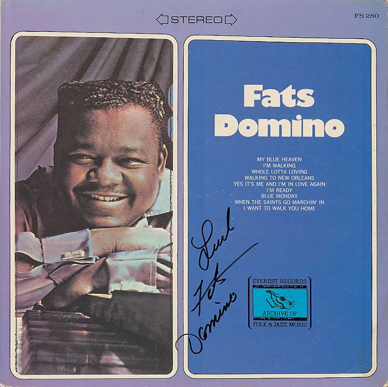 Fats Domino album signed on the front cover in black felt tip, “Luck, Fats Domino.” A couple small separations along bottom edge, toning and foxing to back cover, and some light creasing and rippling to front cover, otherwise fine condition. The record is included.