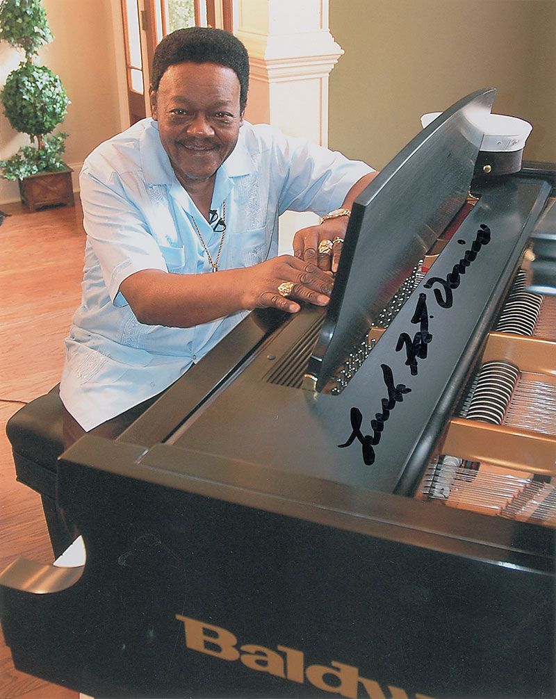 Two satin-finish 8 x 10 photos of Domino seated in front of a piano, one color, each signed in black felt tip, “Luck, Fats Domino.” In fine condition.