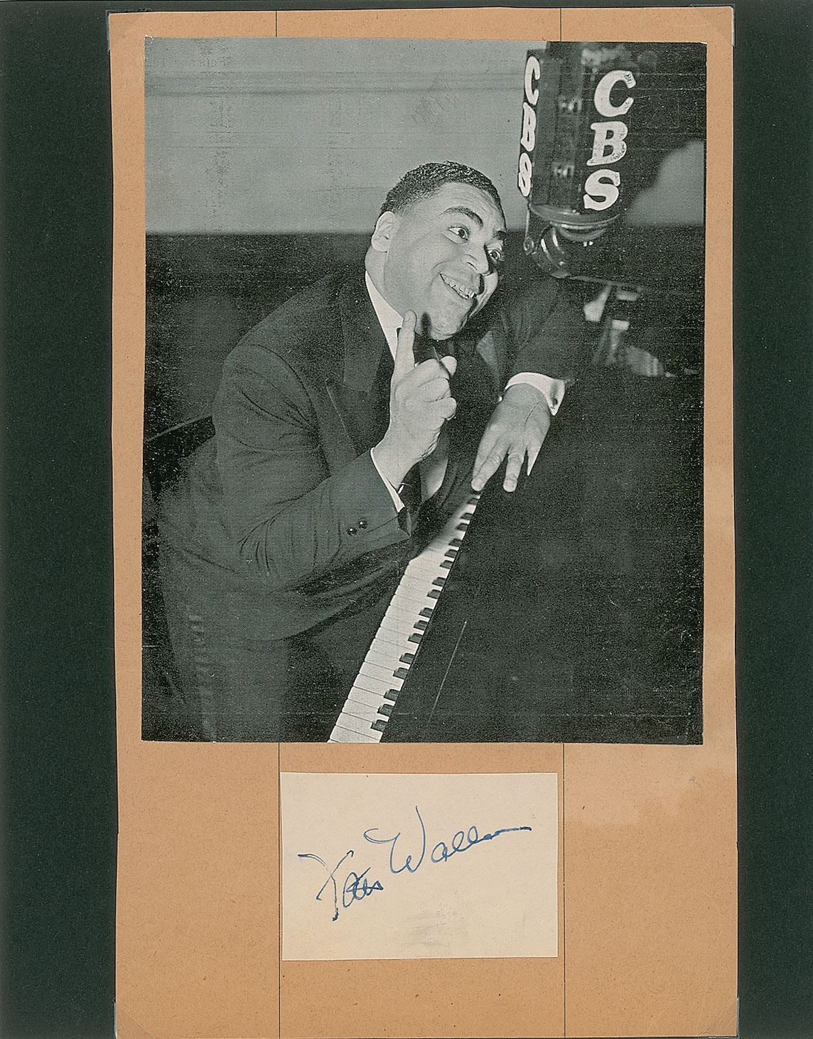 Jazz musician (1904-1943) known for his inimitable stride piano style and standards such as 'Ain't Misbehavin'' and 'Honeysuckle Rose.' Vintage ink signature, "Fats Waller,” on an off-white 2.75 x 1.75 slip affixed to a beige 6.25 x 9.25 sheet with an image of Waller at the piano. Removably corner-mounted to a display sheet. In fine condition. Accompanied by an original Swedish program for a Fats Waller concert