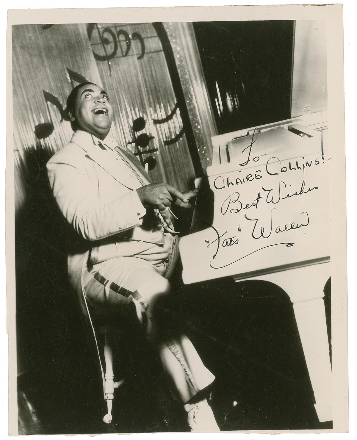 Jazz musician (1904–1943) whose inimitable stride piano style made him one of the greatest players ever. As a songwriter, Waller produced such standards as ‘Ain’t Misbehavin’ and ‘Honeysuckle Rose.’ Vintage glossy 7.75 x 9.75 photo, signed and inscribed in fountain pen “To Claire Collins, Best wishes, ‘Fats Waller.’” In very good condition, with trimmed edges, and overall surface marks and creases.