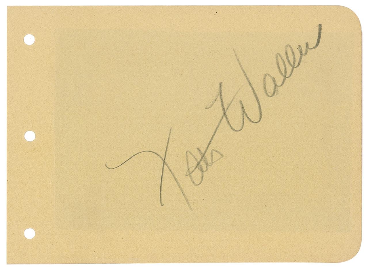 Jazz musician (1904–1943) whose inimitable stride piano style made him one of the greatest players ever. Vintage pencil signature, “Fats Waller,” on a light yellow 6 x 4.5 album page. Reverse bears an affixed vintage ink signature of ‘Crazy Fingers’ Claude Hopkins. In fine condition, with some light wrinkling, and a vertical crease to left side.