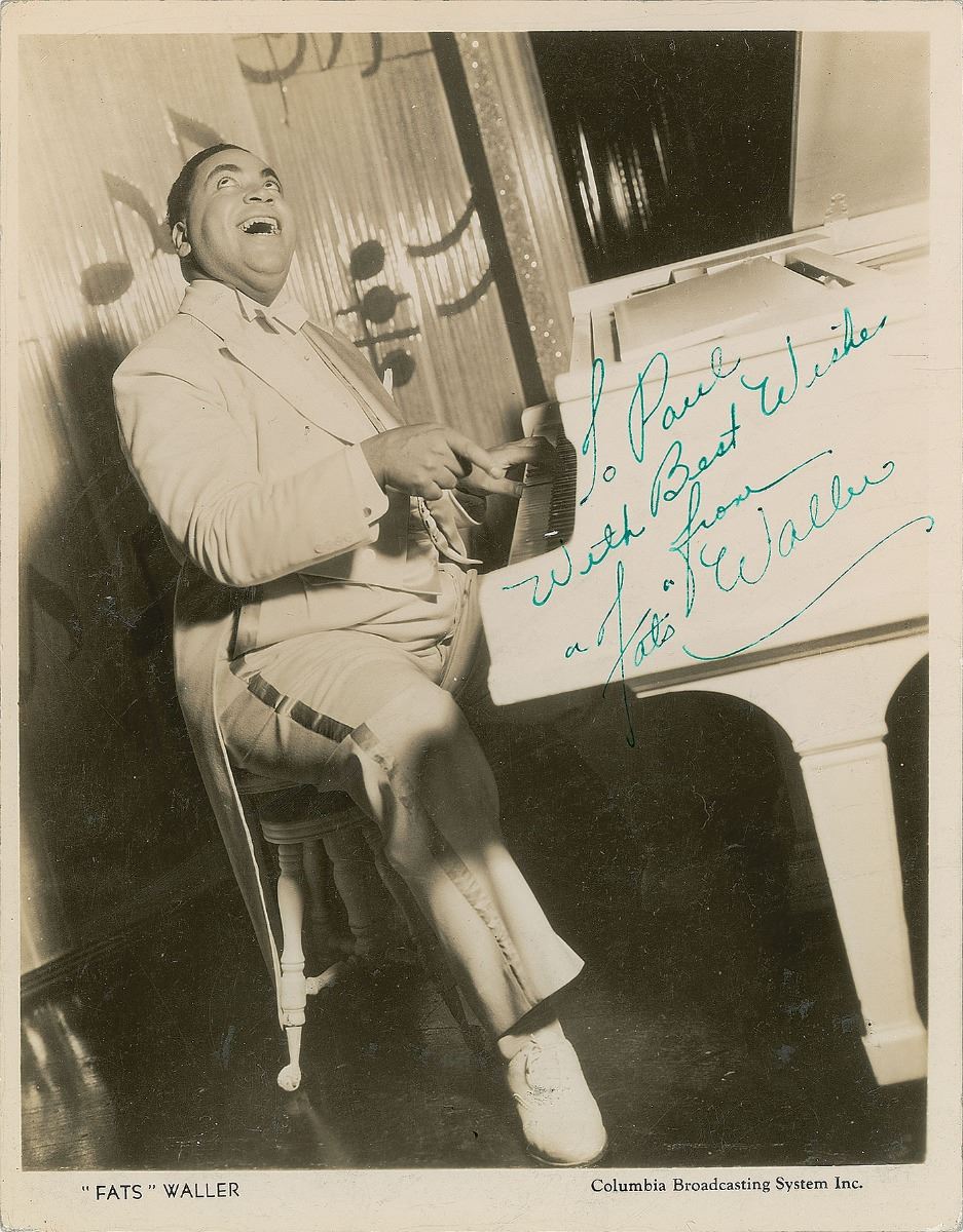 Great vintage glossy 8 x 10 Columbia Broadcasting System publicity photo of Waller at his piano, signed and inscribed in fountain pen, “To Paul, With Best Wishes, from ‘Fats’ Waller.” In fine condition, with some areas of slight irregularity to the emulsion.