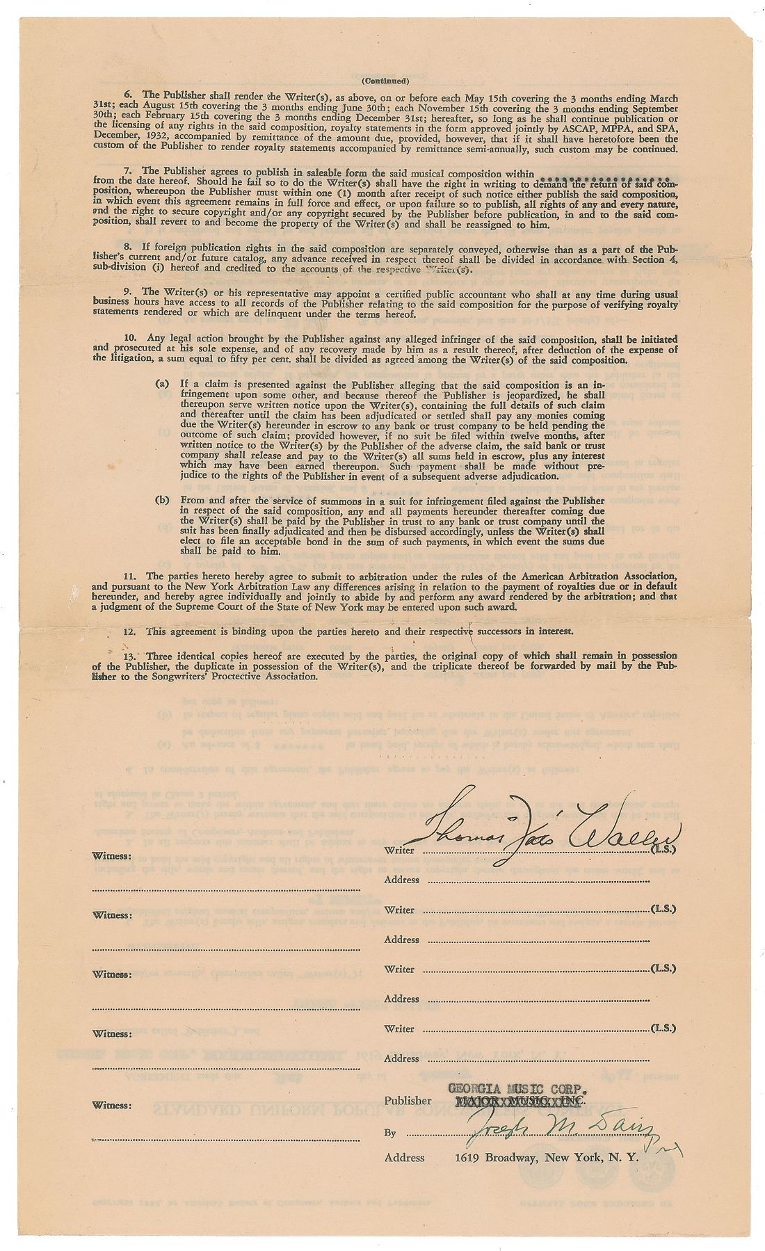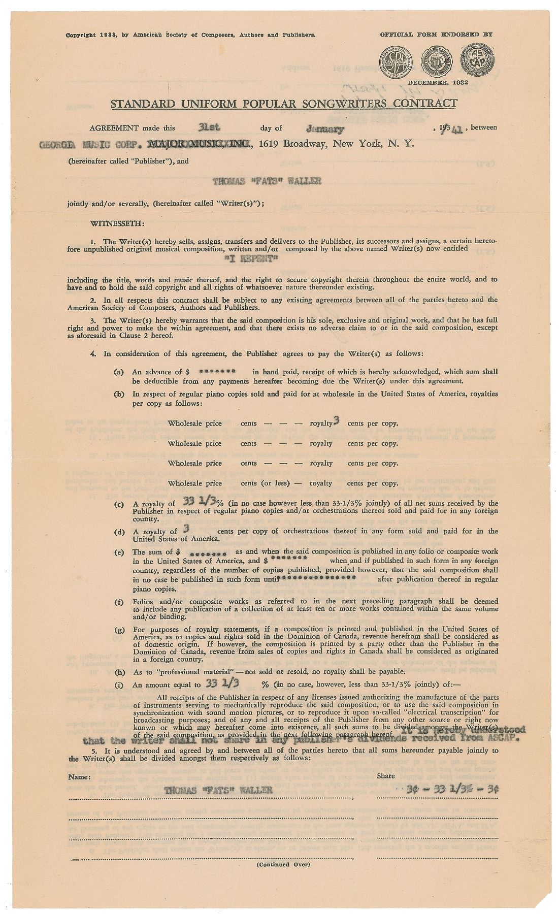 DS, signed “Thomas 'Fats Waller,” one page both sides, 8.25 x 13.75, January 31, 1941. Standard Uniform Popular Songwriters Contract between Waller and the Georgia Music Corp., transferring the rights to print "a certain heretofore unpublished original musical composition…now entitled 'I Repent'"…for 33 1/3% of "all net sums received by the Publisher." Signed at the conclusion in black ink by Waller. In fine condition.