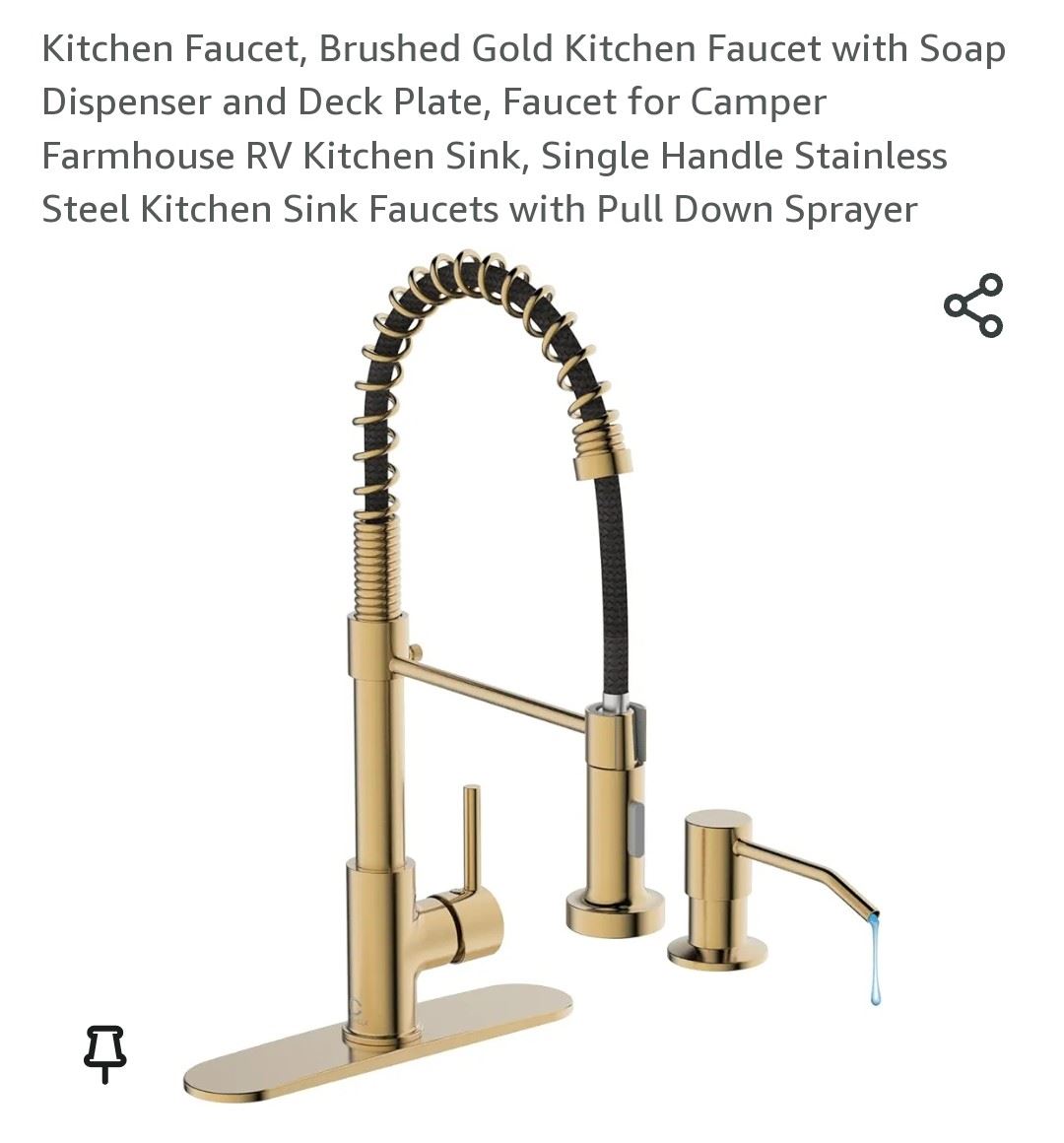 Brushed gold finish with flexible pull-down sprayer, includes soap dispenser and deck plate, new.
