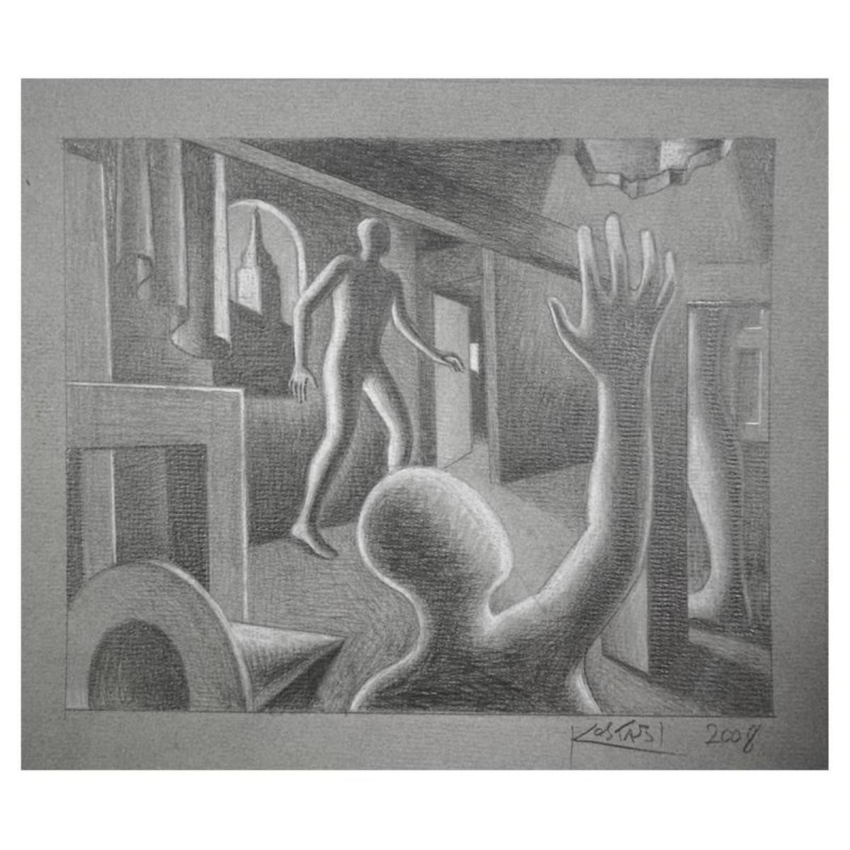 Fault Lines by Kostabi Original. "Fault Lines" is an original artwork, pencil on paper, by Mark Kostabi. The piece is hand signed and comes with a certificate of authenticity. Measures approximately9" x 10.5".
