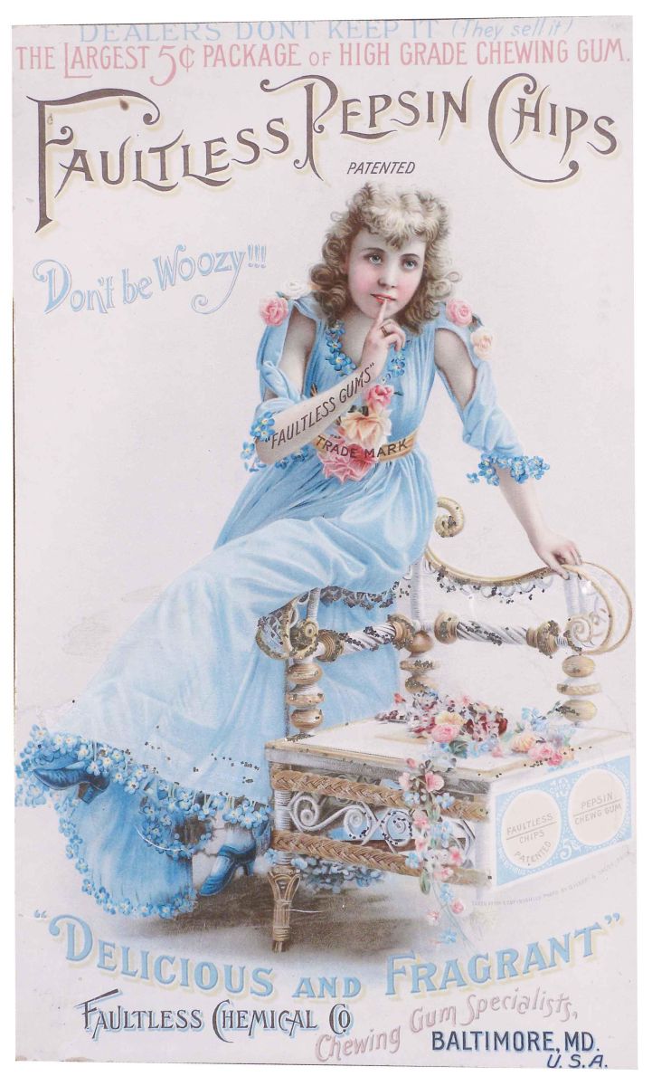 Faultless Pepsin Gums Paper Sign, entitled, "Don't Be Woozy". Faultless Chemical Company, Chewing Gum Specialists Baltimore, MD. Slight trim top and bottom otherwise excellent condtion. Framed under glass. 6 X 10 inches image only. Start Price $100