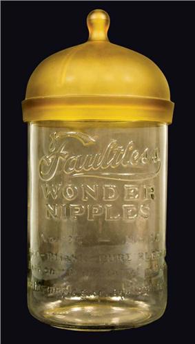 Faultless Wonder Nipple Jar for baby bottle nipples. Extremely rare, only the third one we have ever run across. Embossed jar with original lid, no chips or cracks. 6 1/2 inch dia X 13 inches tall.