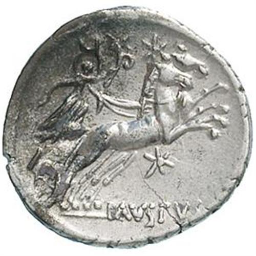 Repubblica Romana. Faustus Cornelius. Denarius, 56 a.C. D/ Busto di Ercole a destra. Dietro, FEELIX. R/ Diana su biga al galoppo a destra. Nel campo, tre stelle. Sotto i cavalli, FAVSTVS. Cr. 426/2. B. 60. gr. 3.65 RR. AG. qSPL.