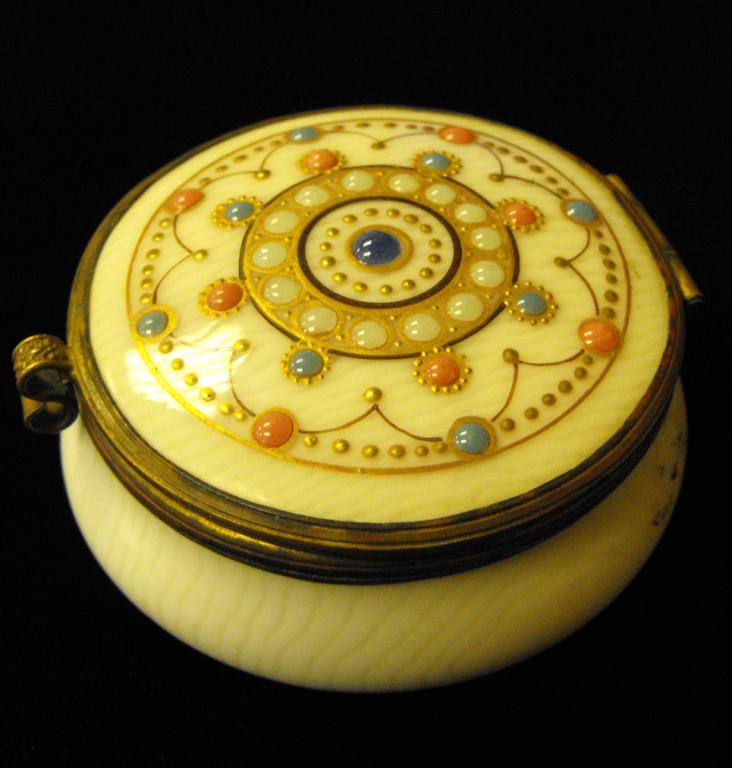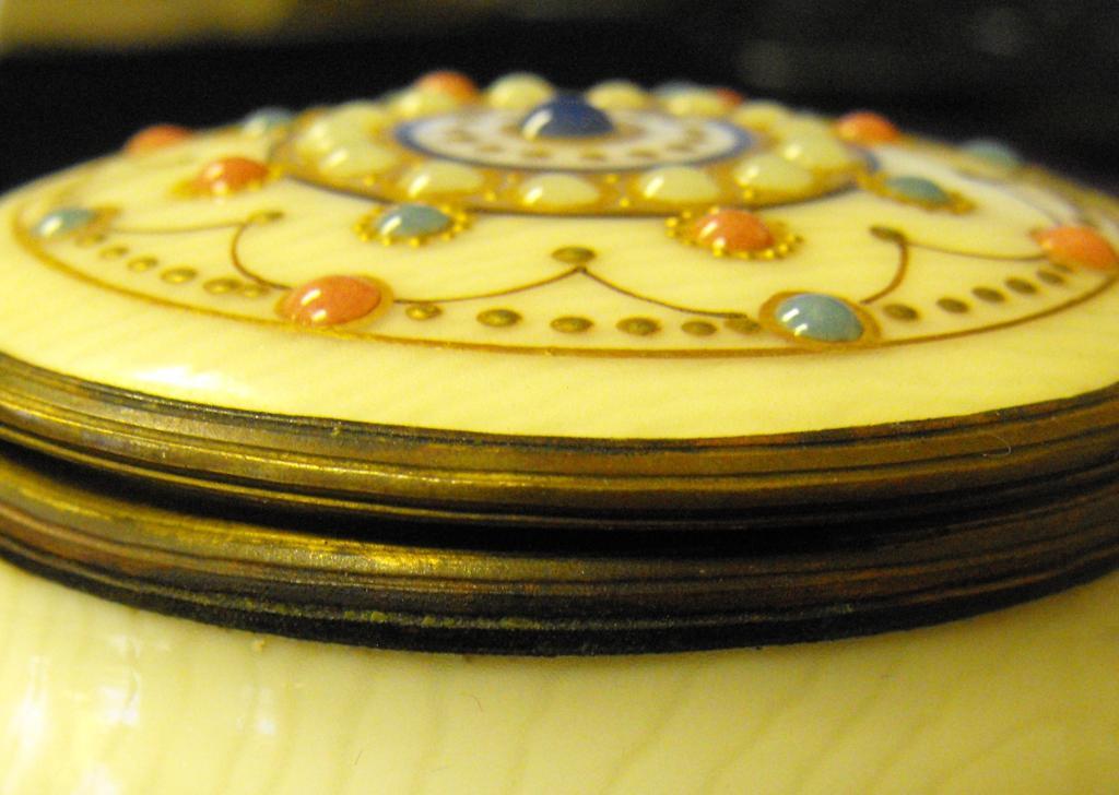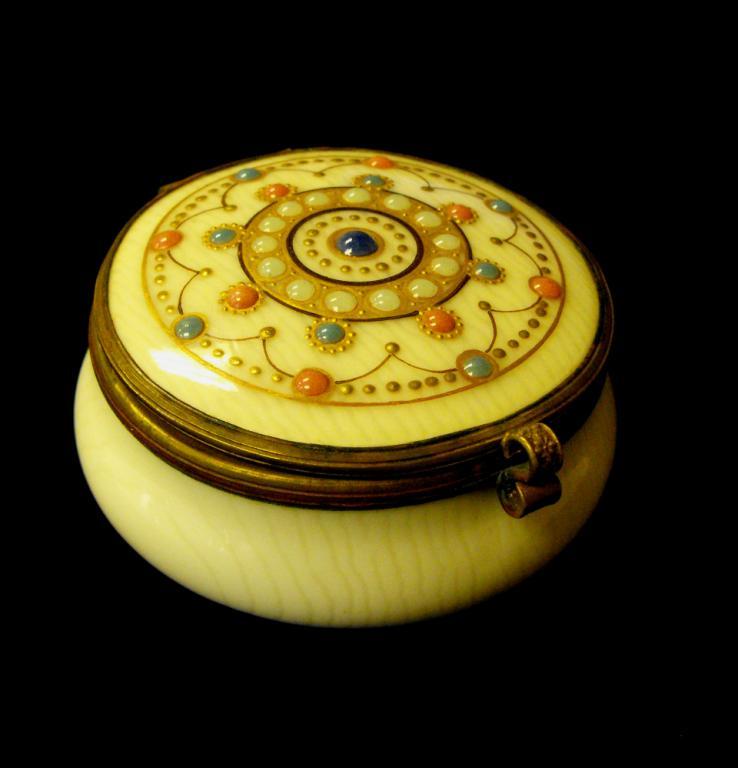 A nicely jeweled faux ivory trinket box. The item has ivory type grain in the porcelain base and lid. Jeweled top. 1.5 x 2.5