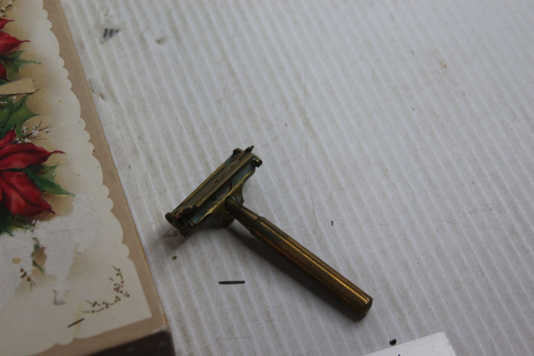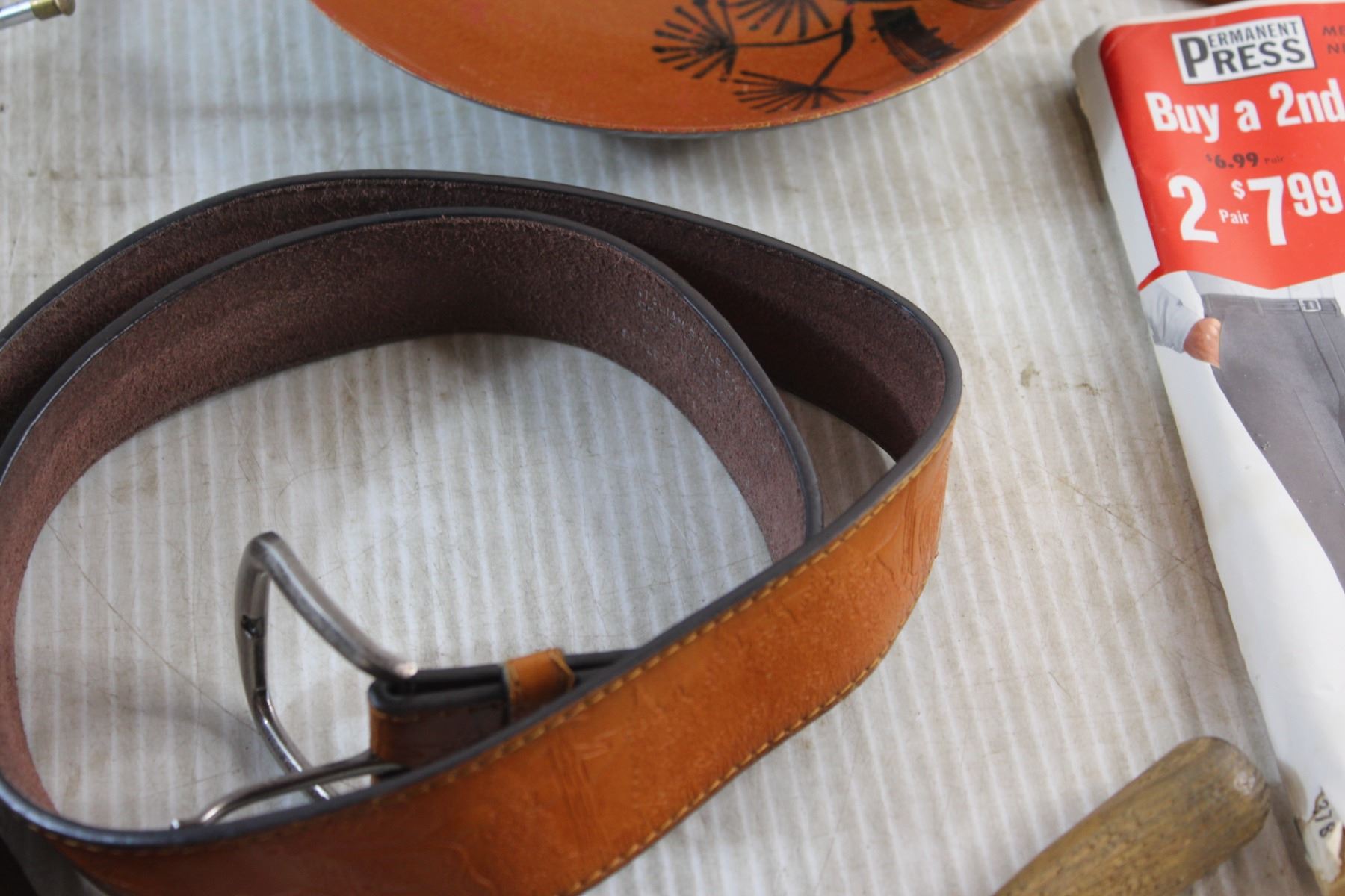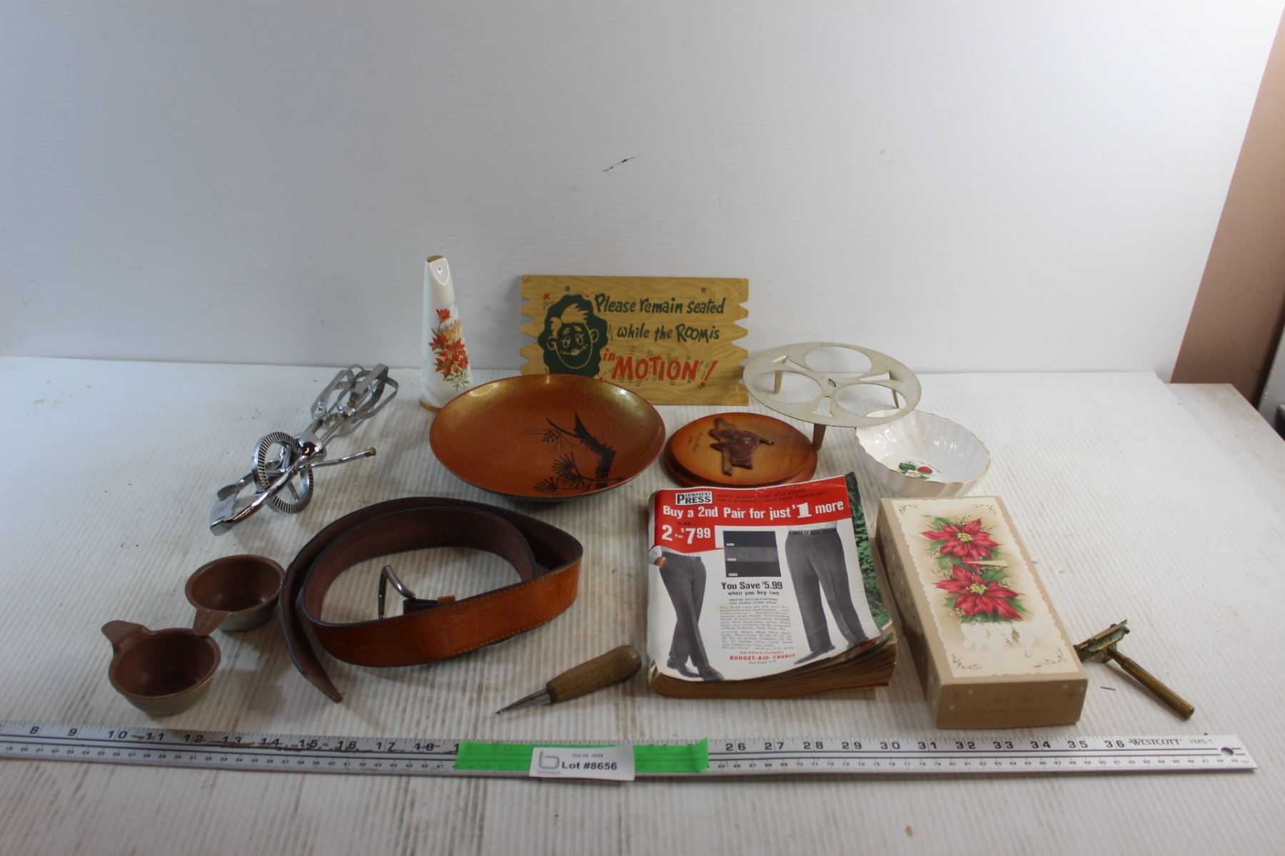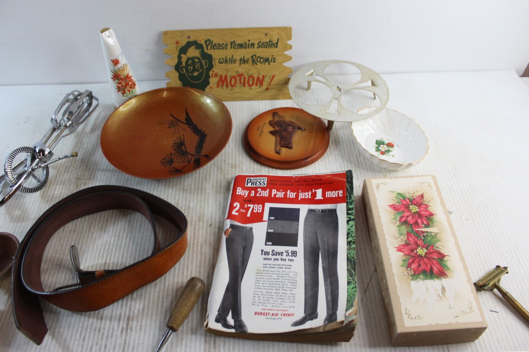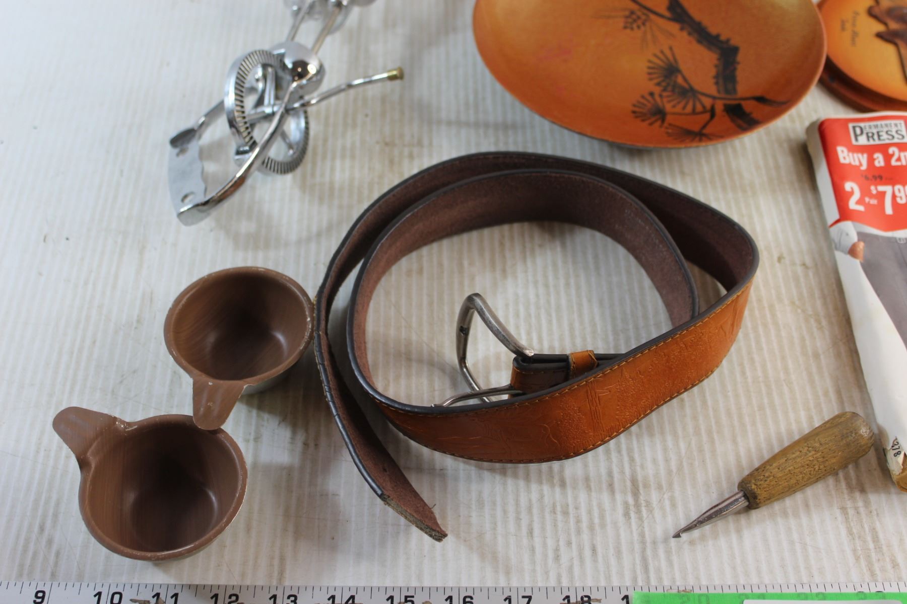 Faux Leather Belt, Vintage Hand Whisk, Brass Razor, Permanent Press Magazine and Assorted Items