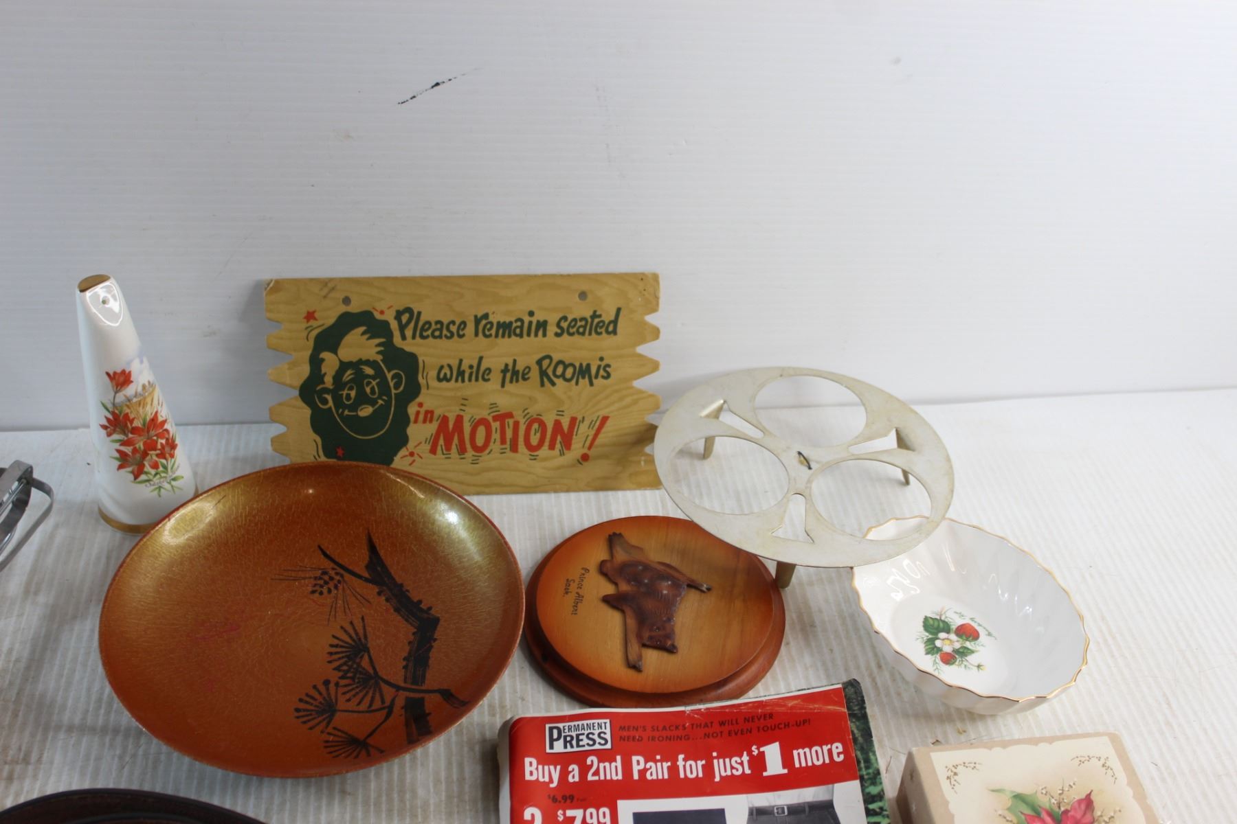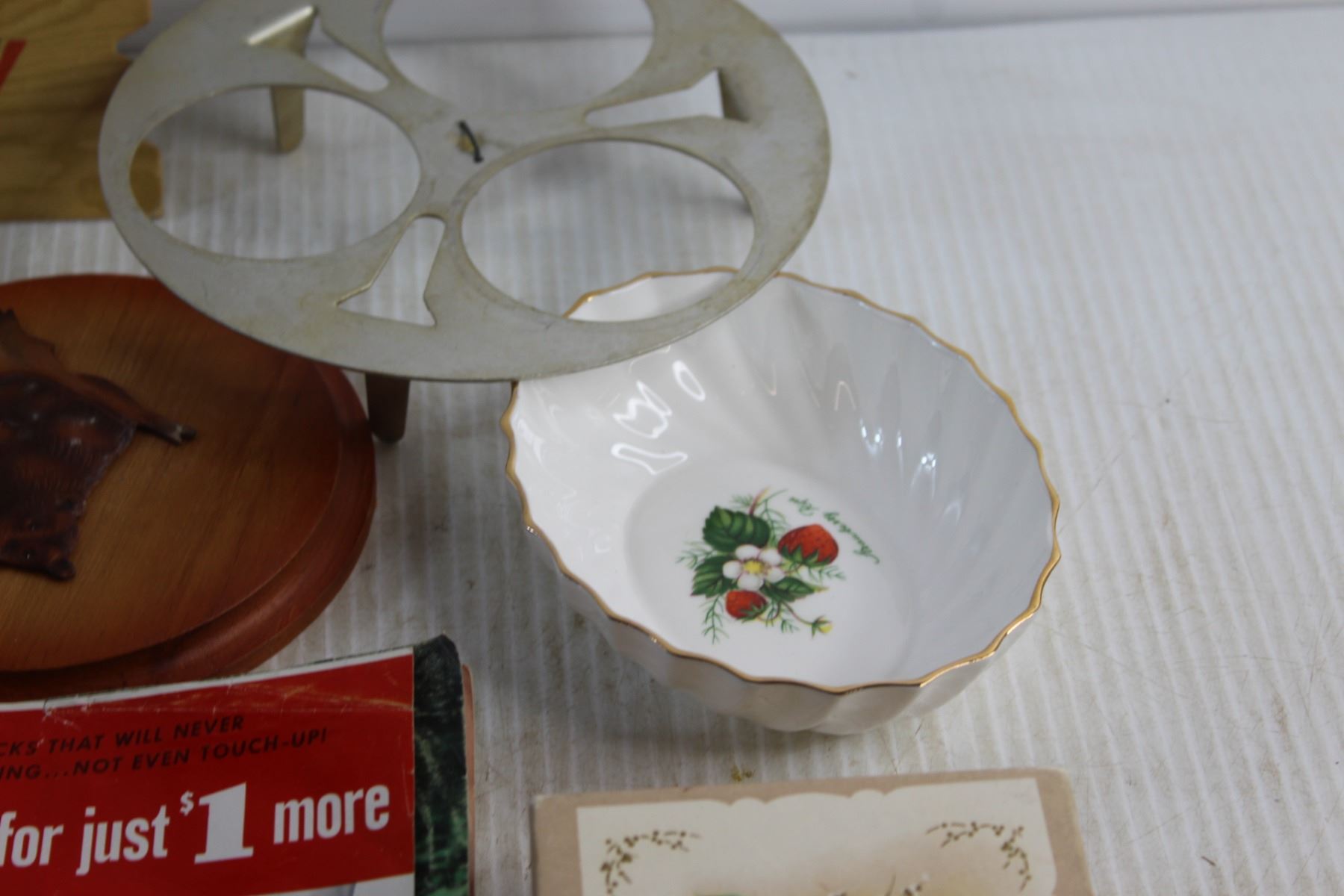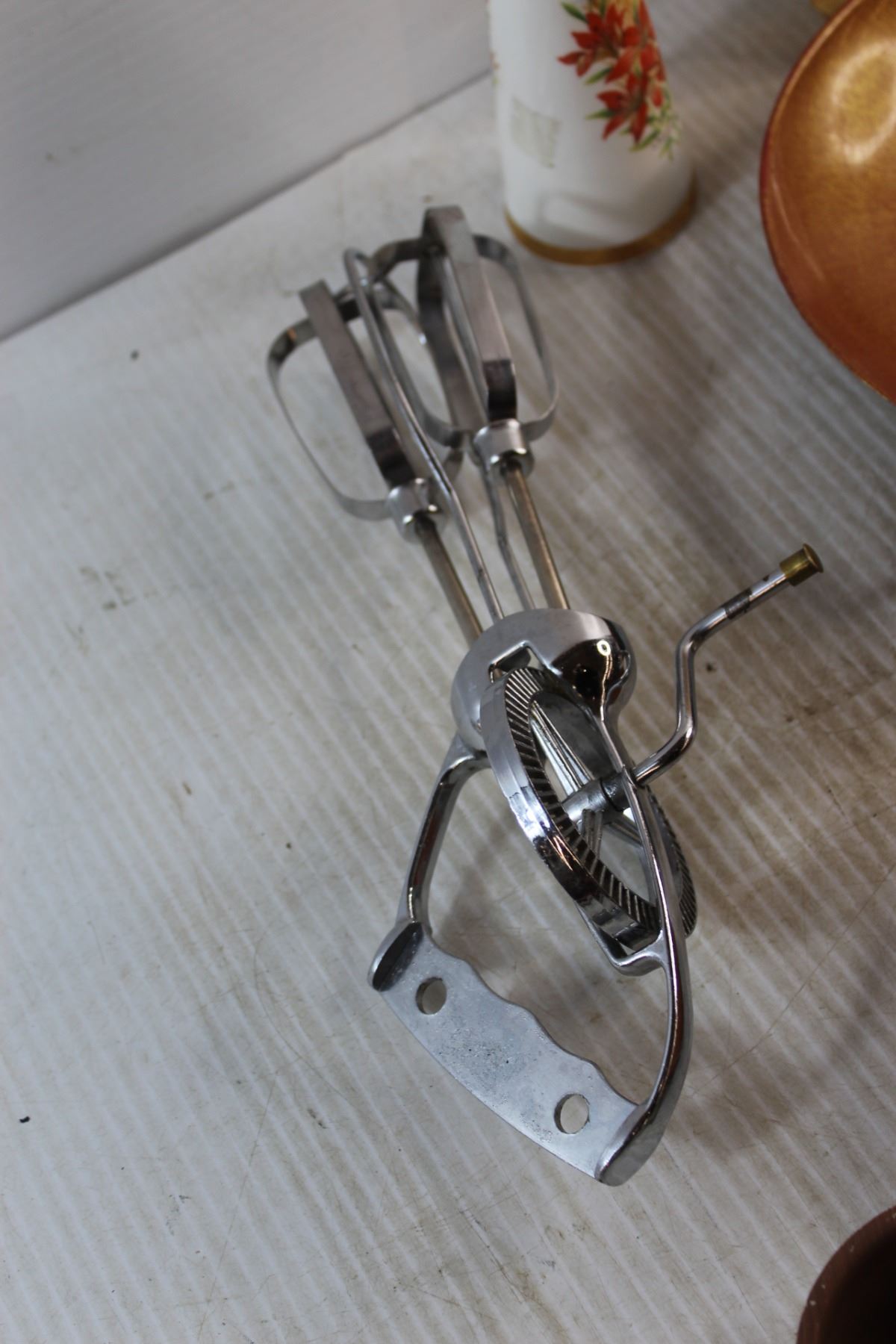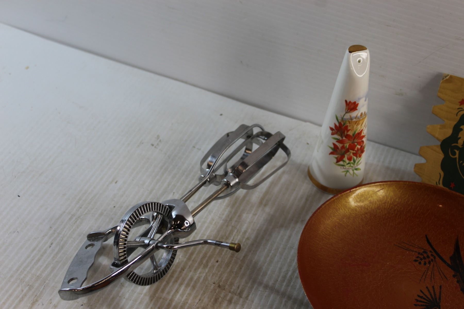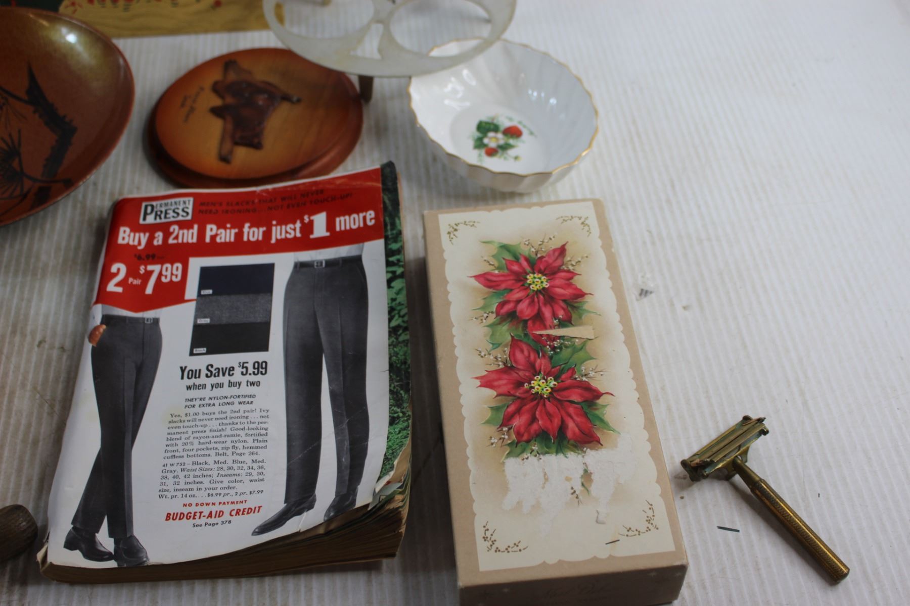Faux Leather Belt, Vintage Hand Whisk, Brass Razor, Permanent Press Magazine and Assorted Items