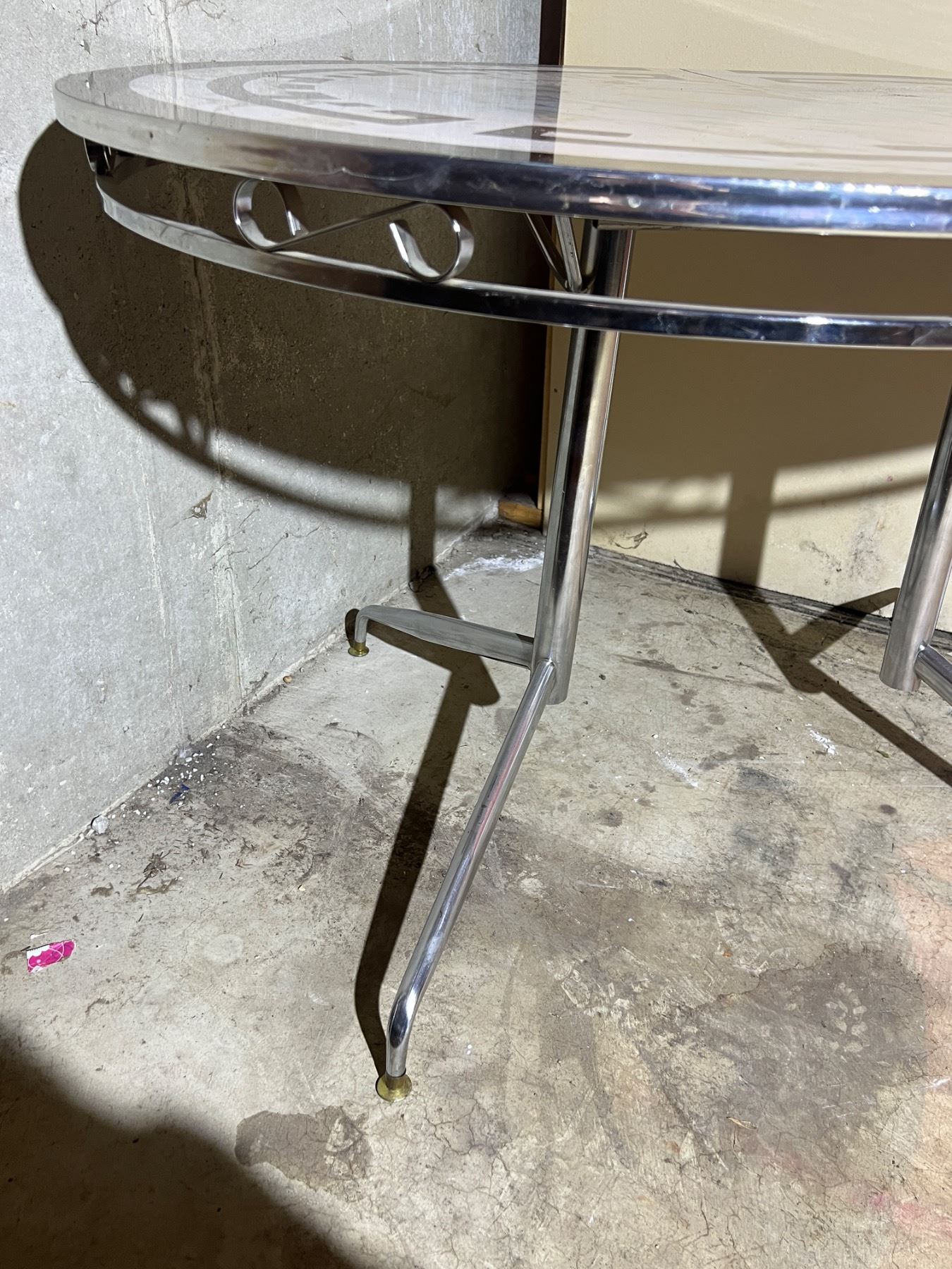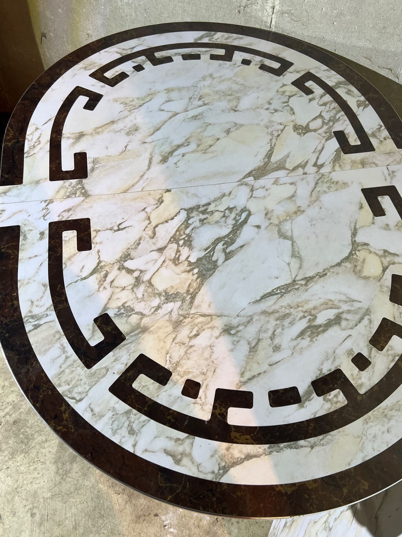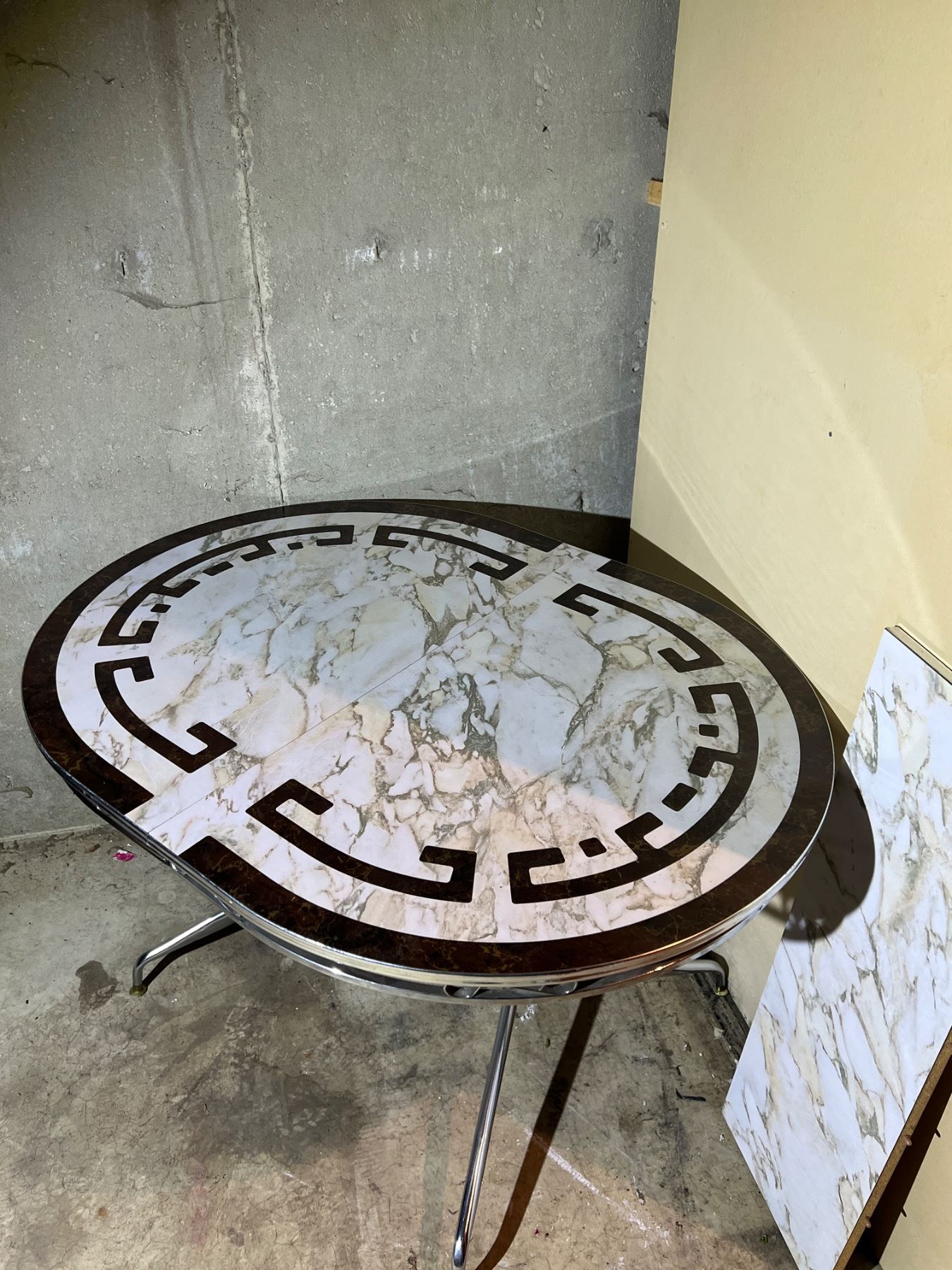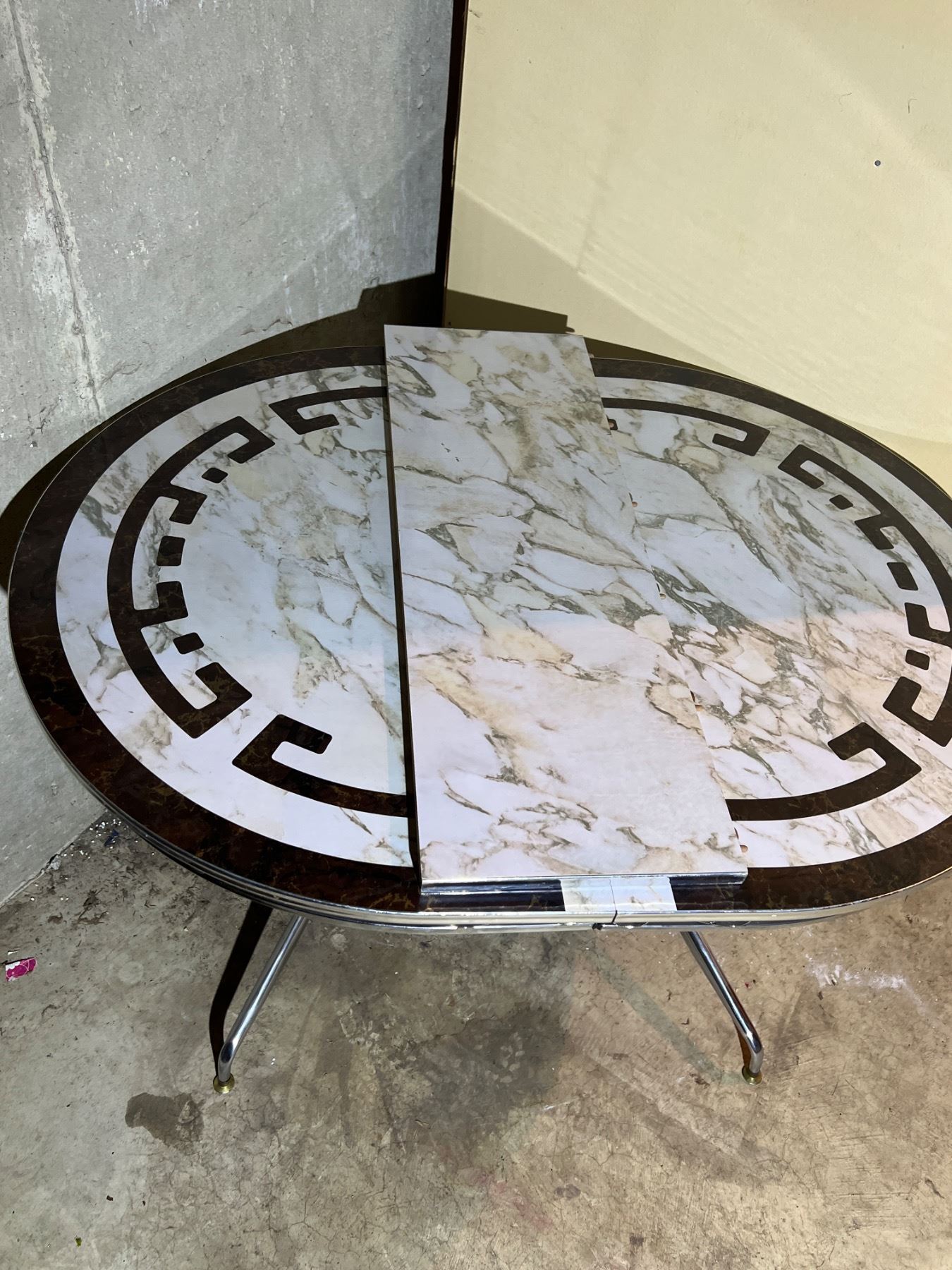 Has laminate faux marble panels. Measures 29" tall by 48" by 36" and leaf is 12" wide.