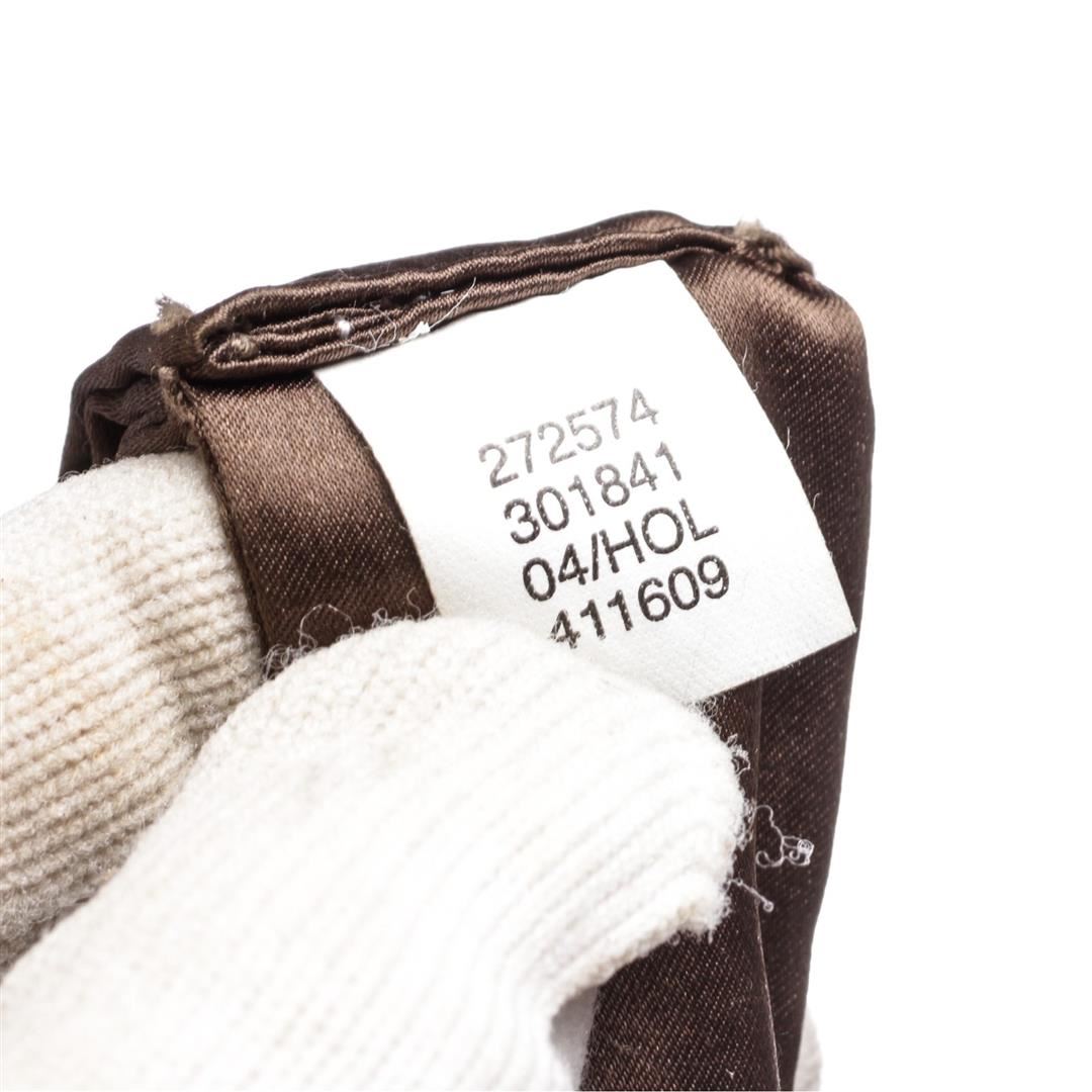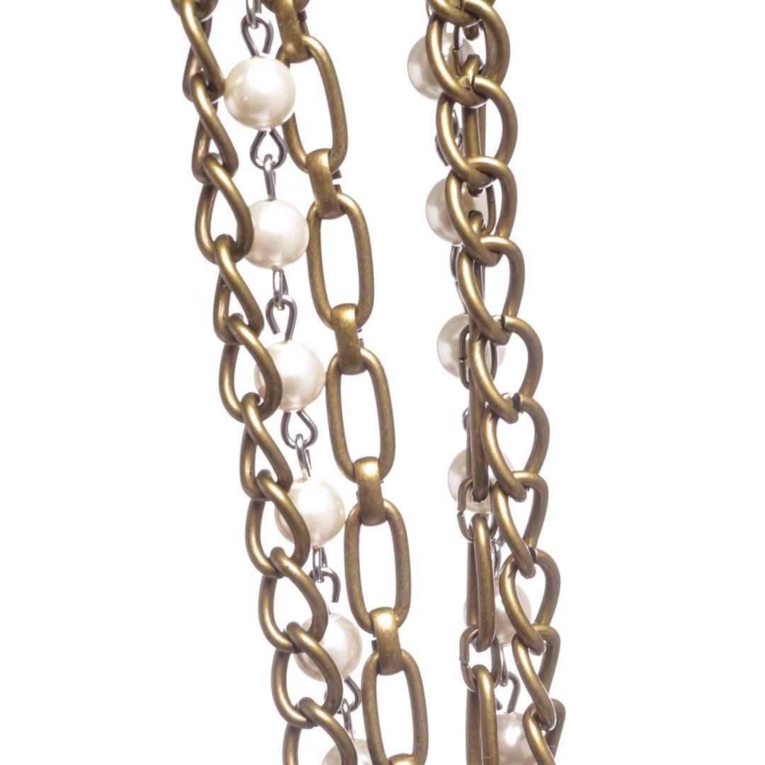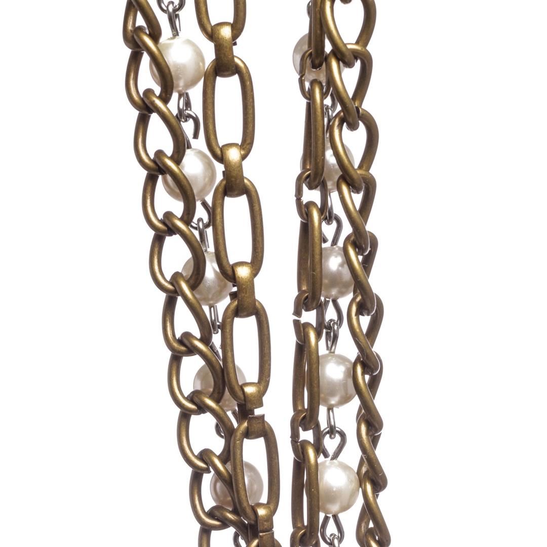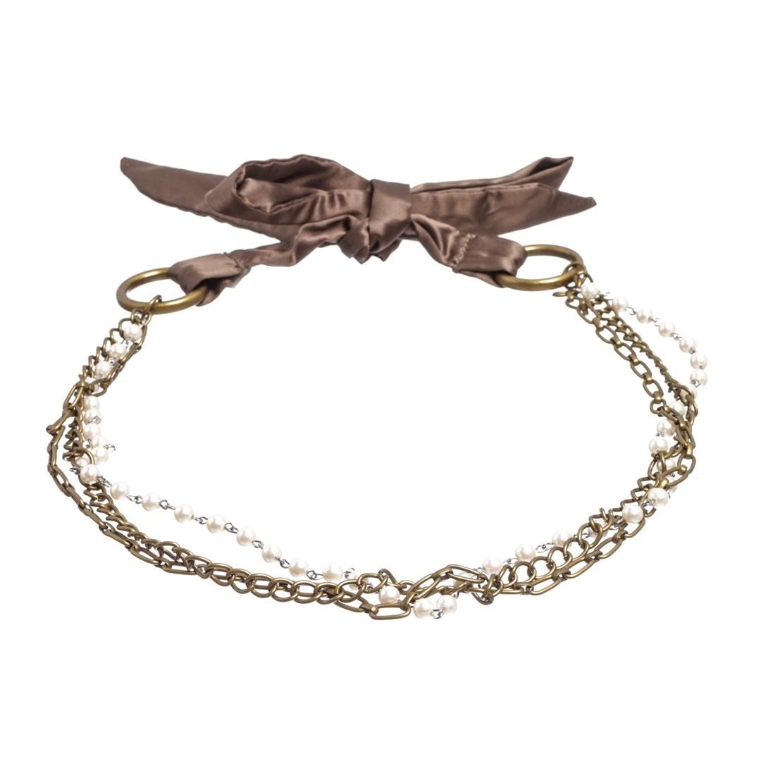 Crafted out of faux pearls, bronze color and silver tone chains, and brown ribbon tie backing.