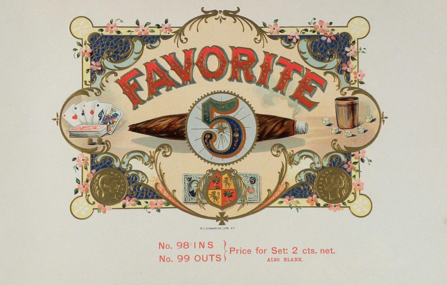 "Favorite 5" Embossed Cigar Sample Label. Gambling motif with five dollar not vignette. Excellent condition. 8 3/8 X 5 1/2 inches. Start Price $100