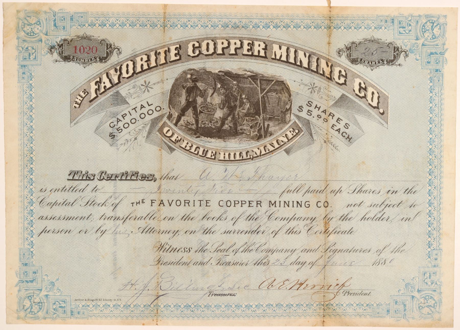 "of Blue Hill, Maine." No. 1020, issued for 25 shares to AW Thayer on June 23rd, 1880. Signed by president AE Herrick and secretary HJ Billings. Not cancelled. Blue border and background, white title, and nice underground mining vignette. Printed by Arthur S. Bonnell, NY. Very deep folds with some separation and heavy soiling along fold lines (mostly evident on reverse. 7.5 x 10.25" Not in Filer or other Holabird indexes. No production information found. Blue Hill is a town in Hancock County, Maine. The area is a small mining district that was active in the last 1870s into the mid-1880s, with a few small periods of revival in the latter 1910s and in the 1960s. The principal ores contained copper and manganese, but only a few ventures were economically successful. [mindat.org] City: Blue Hill State: Maine Date: 1880