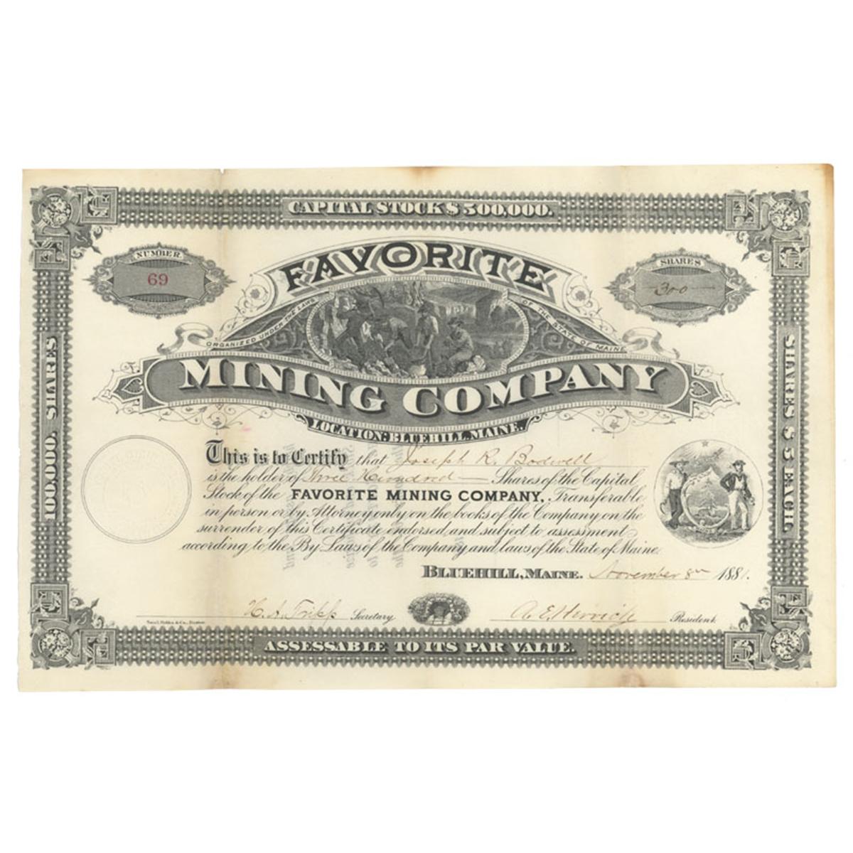 1881, Maine. Stock certificate for 300 shares. Black. Vignette of miners at work at top center, Maine state seal at right. Mine located at Bluehill, Maine. Age toning along fold and at outer margins. Uncancelled and fine.