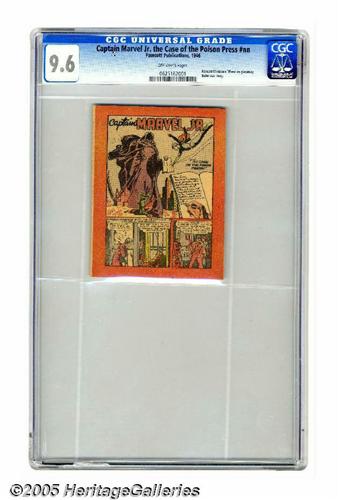 <B>Fawcett Miniatures #nn - Captain Marvel Jr. "The Case of the Poison Press" (Fawcett, 1946) CGC NM+ 9.6 Off-white pages.</B></I> Wheaties giveaway. Bulletman also appears. Overstreet 2005 NM- 9.2 value = $195. CGC census 6/05: 3 in 9.6, none higher.