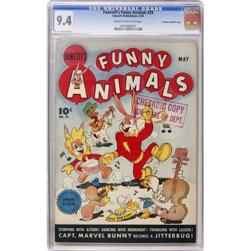 <B>Fawcett's Funny Animals #29 Crowley Copy pedigree (Fawcett, 1945) CGC NM 9.4 Cream to off-white pages.</B></I> Hoppy, the Marvel Bunny cover. Checking Copy stamp on cover. Overstreet 2006 NM- 9.2 value = $80. CGC census 3/07: 2 in 9.4, none higher.<BR><BR><b>Shipping:</b> Slabbed Comic (<a target=""_blank"" href=""http://www.heritageauctions.com/common/shipping.php"">view shipping information</a>)