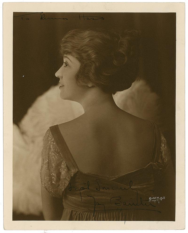 American actress (1893–1968) who won the 1938 Academy Award for Best Supporting Actress for her role in Jezebel. Vintage matte-finish 8 x 10 photo of Bainter looking over her shoulder, signed and inscribed in fountain pen “To Emma Hass, Most sincerely, Fay Bainter.” In fine condition.