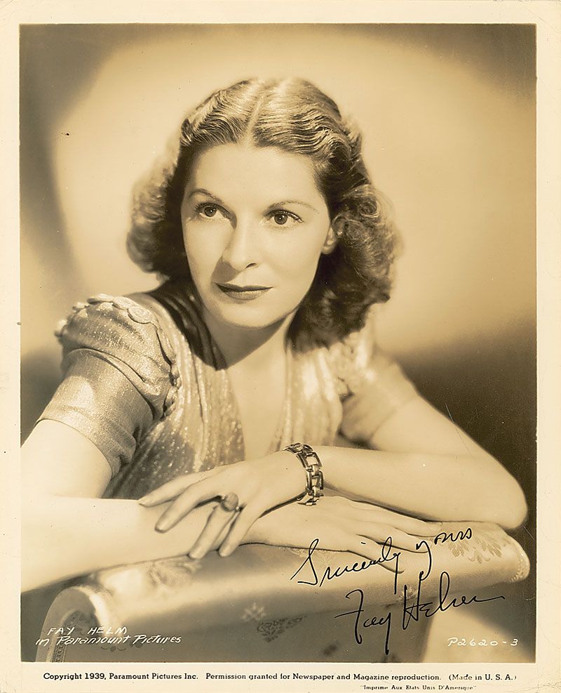 Actress (1909–2003) best remembered for playing Jenny Williams in The Wolf Man. Vintage glossy 8 x 10 Paramount Pictures publicity photo, boldly signed in fountain pen, “Sincerely yours, Fay Helm.” Scattered surface bends and creases, especially to the ri