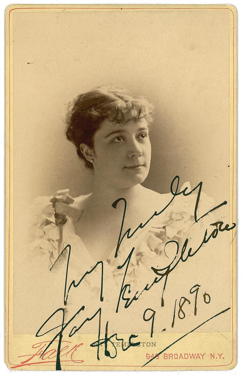 Attractive 4 x 6.5 Falk Studios cabinet portrait, signed “Yours Truly, Fay Templeton Dec. 9, 1890” in black ink. In fine condition with scattered surface marks and spots of soiling.