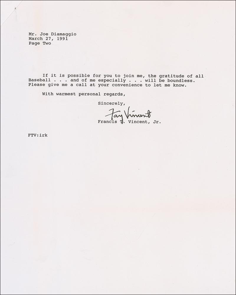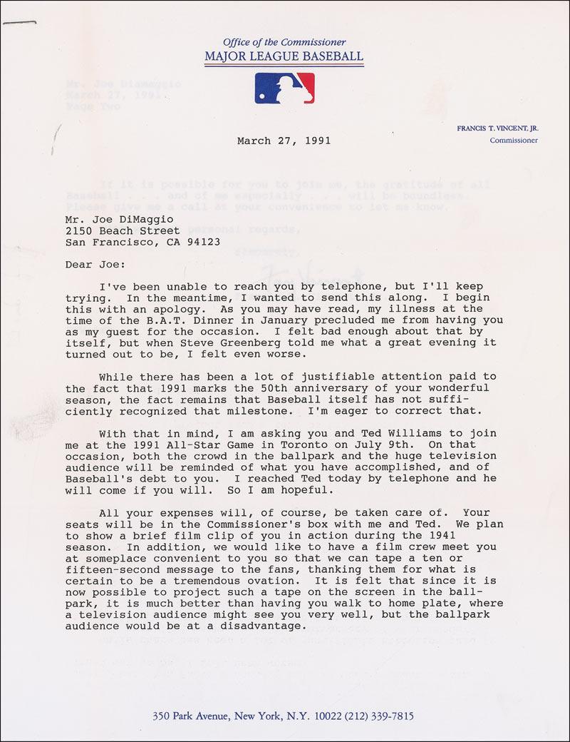 TLS, two pages, 8.5 x 11, Office of the Commissioner letterhead, March 27, 1991. Vincent writes Joe DiMaggio. In part: “While there has been a lot of justifiable attention paid to the fact that 1991 marks the 50th anniversary of your wonderful season, the fact remains that Baseball itself has not sufficiently recognized that milestone. I’m eager to correct. With that in mind, I am asking you and Ted Williams to join me at the 1991 All-Star Game in Toronto on July 9th. On that occasion, both the crowd in the ballpark and the huge television audience will be reminded of what you have accomplished, and of Baseball’s debt to you.” In fine condition, with a spot of soiling, staple at the top left, and a small strip of toning on the first page. Both baseball immortals joined Vincent at the game…and were applauded for their contributions to the National Pastime. A great letter mentioning two immortals as baseball prepares to celebrate the 50th anniversary of DiMaggio’s streak and William’s .406 average.
