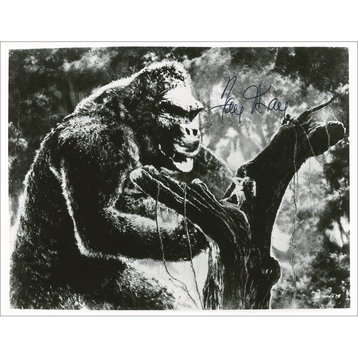 Glossy 10'' x 8'' black and white photo of Fay Wray being menaced by King Kong, signed in black felt tip. In fine condition, with a few scattered creases.