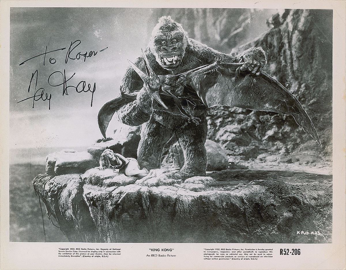 Glossy 10.25 x 8 RKO Radio Pictures publicity photo for the 1952 rerelease of King Kong, signed and inscribed in black felt tip, “To Roger—Fay Wray.” In fine condition, with some corner creasing.