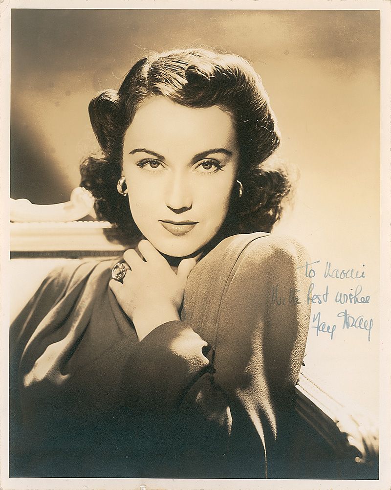 Vintage matte-finish 8 x 10 photo, signed and inscribed in fountain pen “To Naomi, with best wishes, Fay Wray.” Some corner tip creasing, a surface crease to the left side, a couple dings to the bottom edge, silvering to dark areas of the image, and some light spotting to the finish, otherwise fine condition.