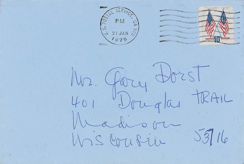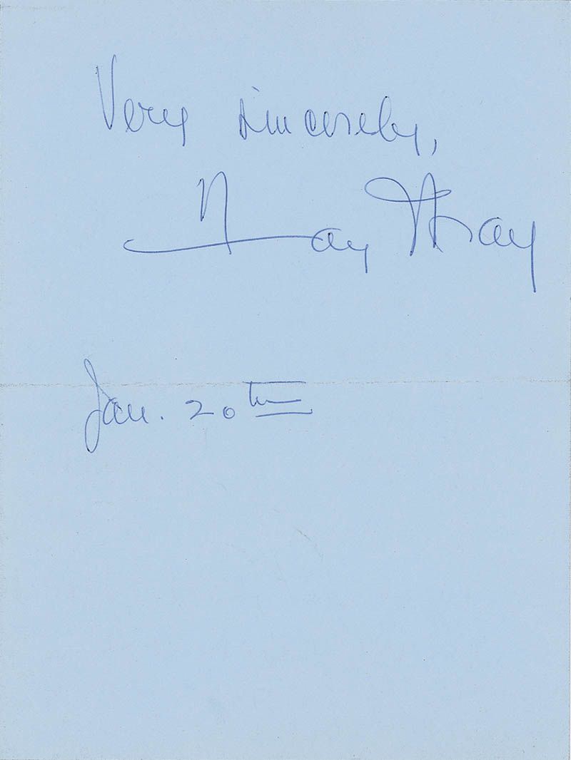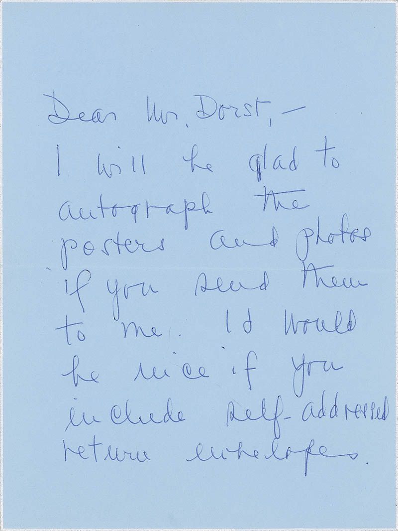 ALS, one page both sides, 5.75 x 7.75, January 20, 1975. Letter to a fan. In part: “I will be glad to autograph the posters and photos if you send them to me.” In fine condition, with a crease to lower right corner. Accompanied by the original mailing envelope addressed in Wray’s hand.