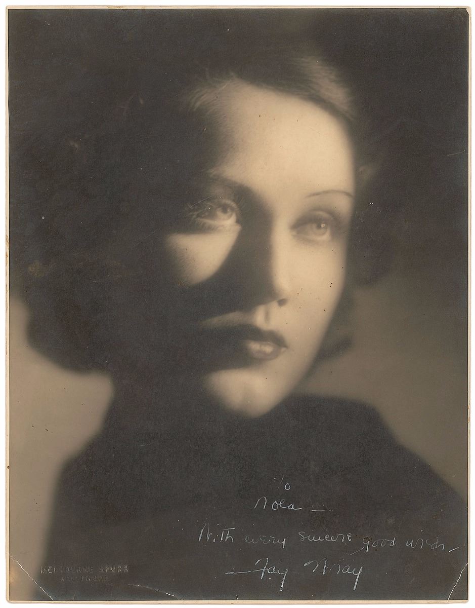Vintage matte-finish 10.5 x 13.5 close-up photo of Wray bathed in shadow, signed and inscribed in white ink, “To Nola—With every sincere good wish—Fay Wray.” Blindstamped in the lower left by renowned Hollywood photographer Melboure Spurr. In very good condition, with moderate scattered soiling, creases to lower corners, some flaking to ink making several letters a couple shades light, and evenly trimmed edges.