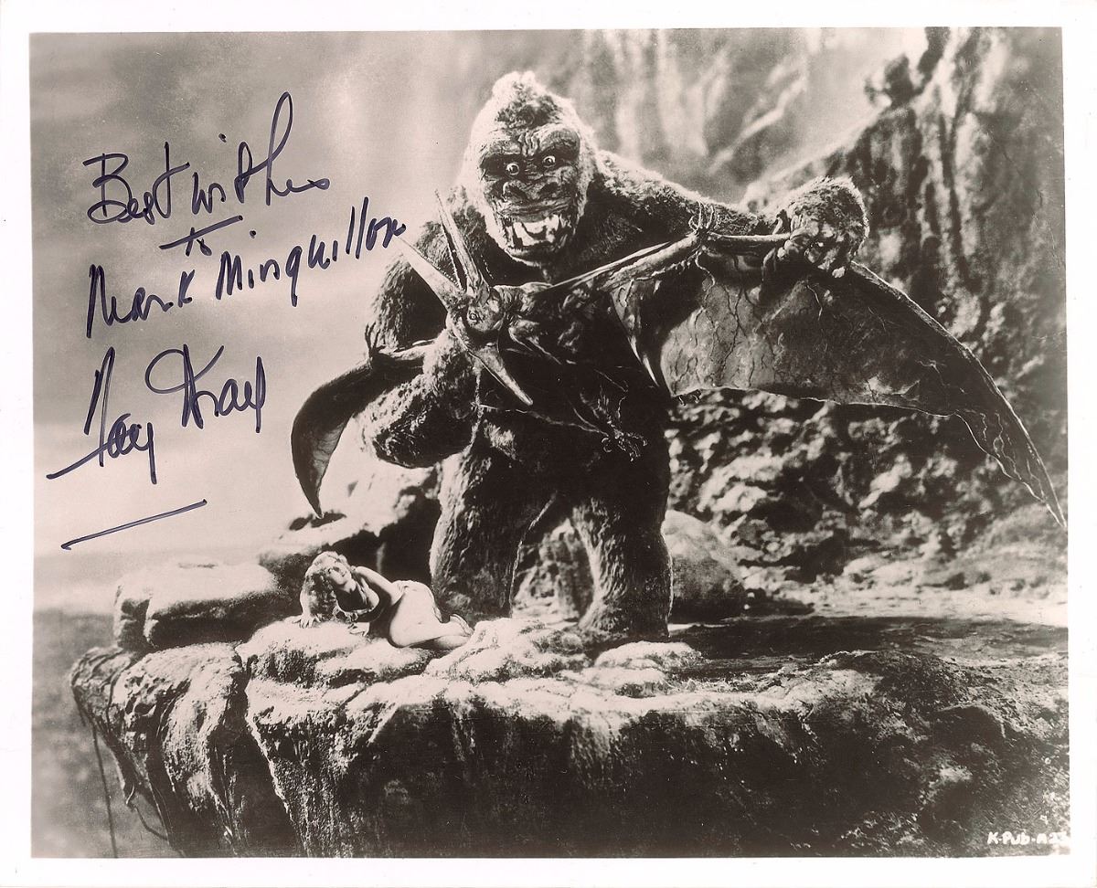 Glossy 10 x 8 photo of Ann Darrow cowering at the feet of King Kong, battling with a pterodactyl, signed and inscribed in black felt tip, “Best Wishes to Mark Minquillon, Fay Wray.” In very good condition, with some creasing.