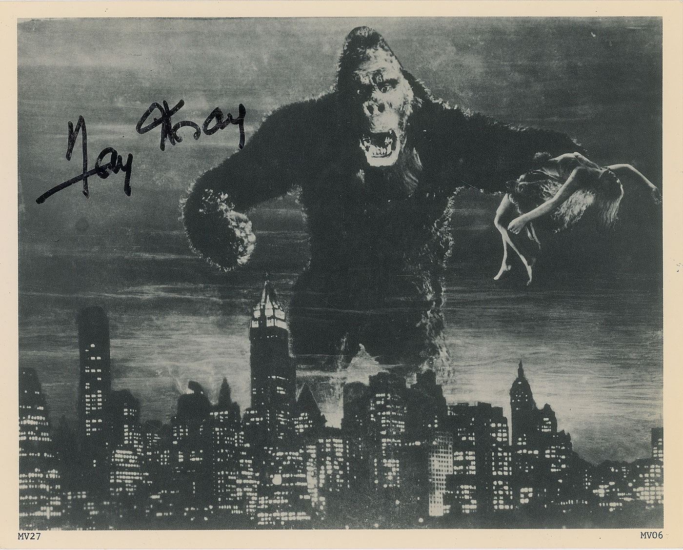 Glossy 10 x 8 photo of an original promotional image used for the 1933 film King Kong, signed in black felt tip by Fay Wray. In fine condition.