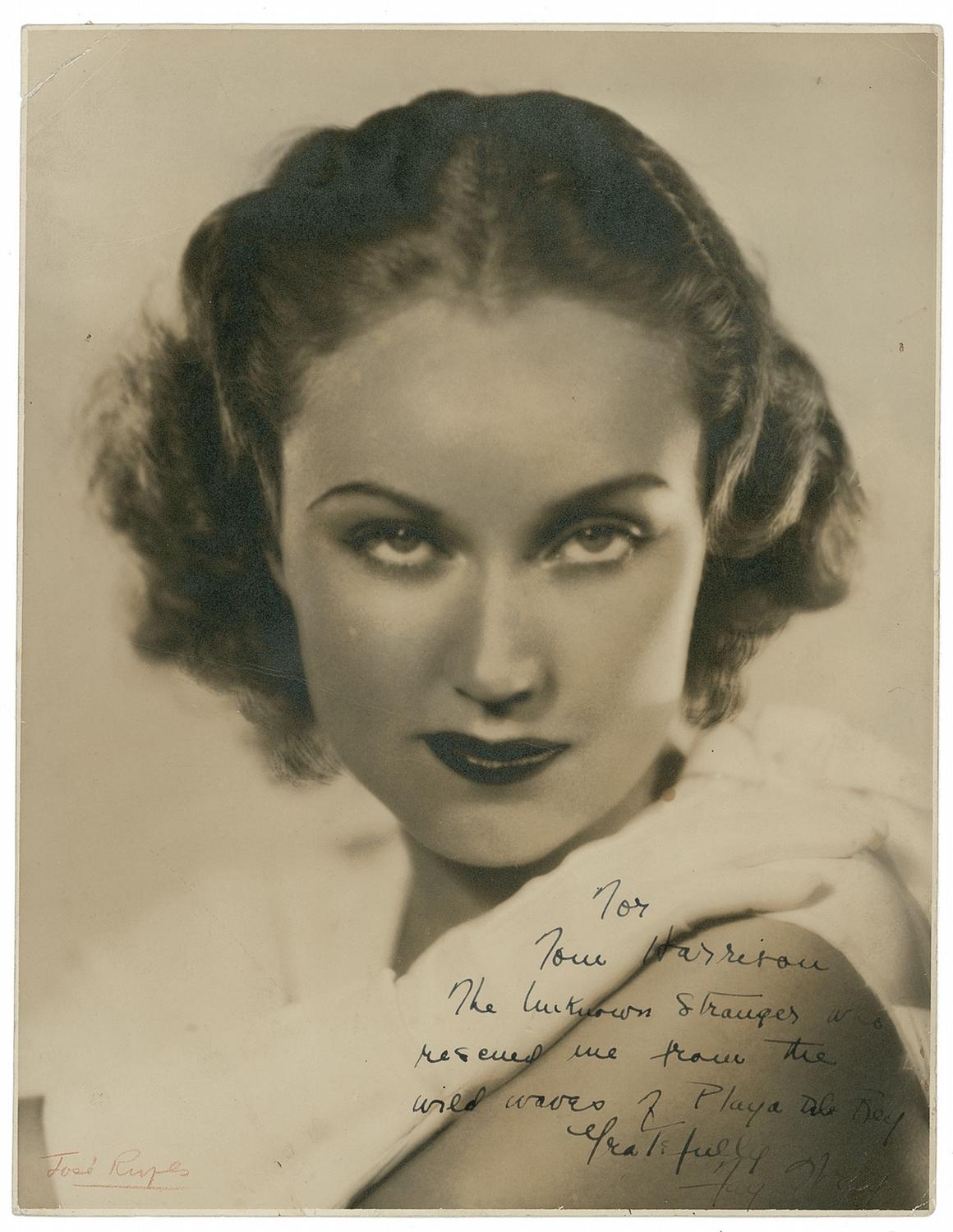 Alluring vintage sepia matte-finish 10.5 x 13.5 photo, signed and inscribed in fountain pen “For Tom Harrison, The unknown stranger who rescued me from the wild waves of Playa Del Rey, Gratefully, Fay Wray.” Photo is also signed in red pencil by the photographer. In very good condition, with scattered surface marks and impressions, corner creases, silvering to darker areas, and some scattered light spotting and soiling.