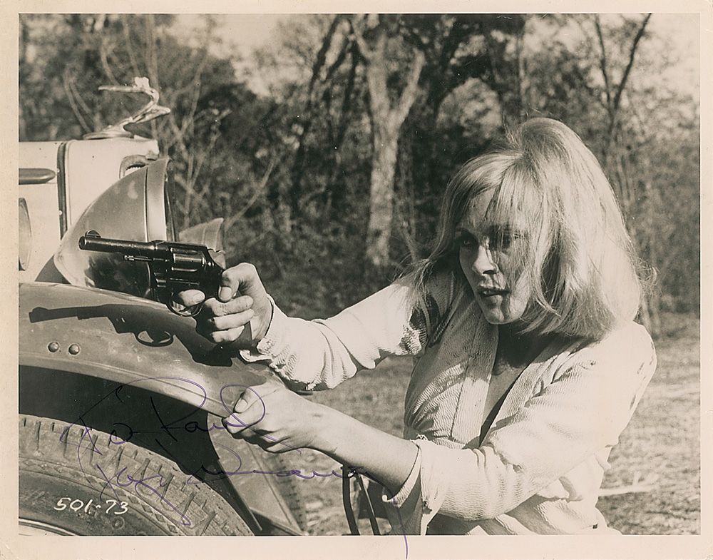 Glossy 10 x 8 photo of Dunaway as Bonnie in 1967’s Bonnie and Clyde, signed and inscribed in-person in purple felt tip “To Paul, Faye Dunaway.” Scattered bends and creases, and some light contrast to inscription and signature, otherwise fine condition.