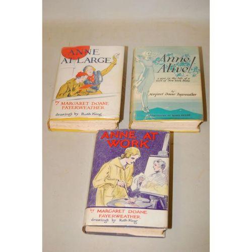 Fayerweather, Margaret Doane. A Group of 3 "ANNE" Books as Listed. New York: Robert M. McBride & Company, First Edition. 8vo - over 7¾" - 9¾" tall. Hard Cover. Good Condition. NOT EX-LIBRARY. All with Dust Jackets, showing edge chips/tears, in protective mylar jackets. All bindings & hinges tight. ***Anne Alive! A Year in the Life of a Girl of New York State. Forward by Eleanor Roosevelt. (1933). INSCRIBED & SIGNED BY THE AUHTOR on the ffp "Inscribed for Betty Struthers by her old friend, the author, Margaret Doane Fayerweather, January 17th 1934". With Betty Struthers bookplate. Illustrated by Robb Beebe. Front cover corners bumped, light foxing on prelims. ***Anne at Work, Illustrated by Ruth King (1935). Spine lightly sunned. ***Anne At Large, Illustrated by Ruth King (1934). Light foxing on prelims, covers show slight darkening at upper edges.